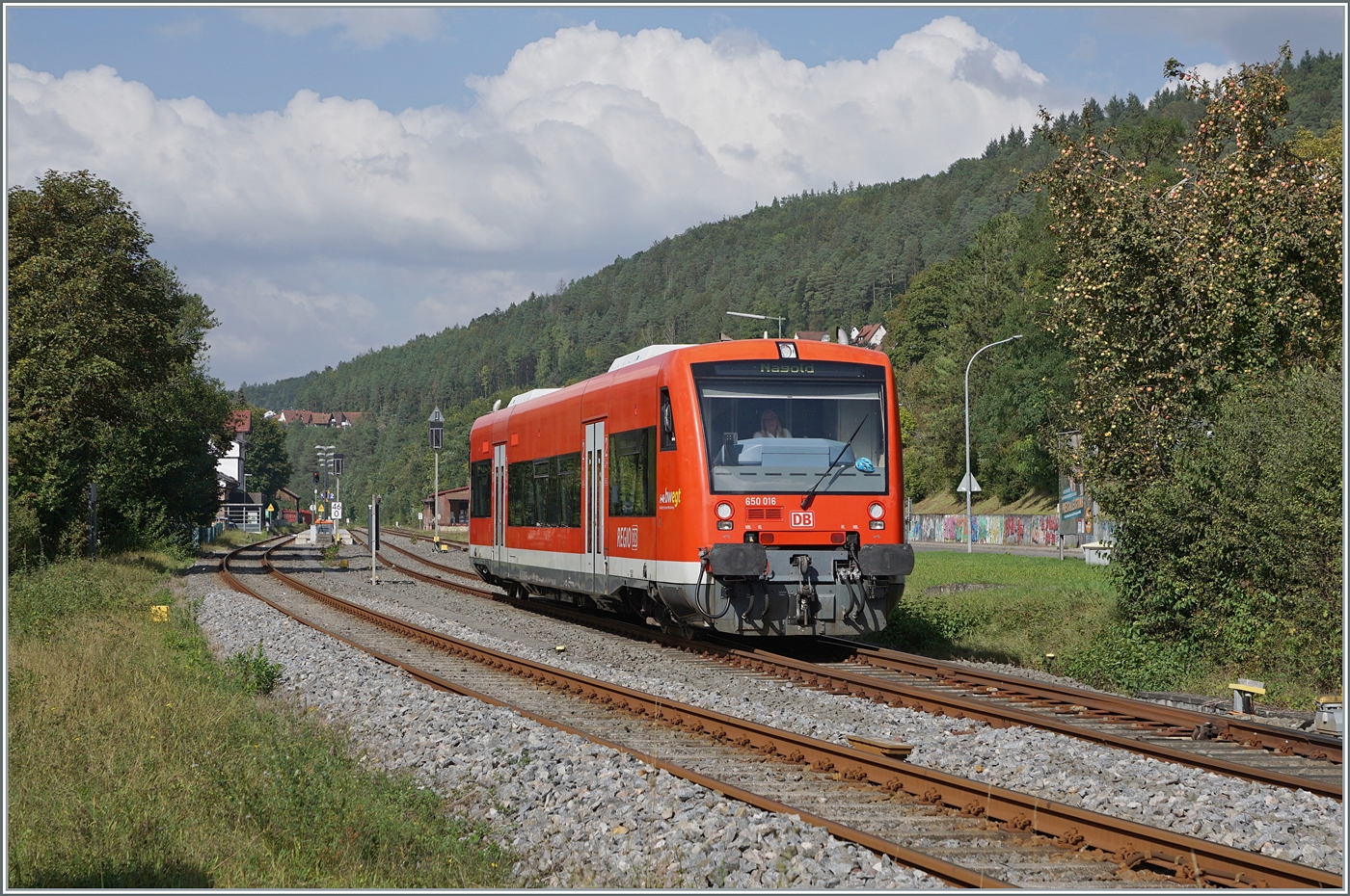 Der DB 650 016 ist als RB74 17937 von Pforzheim nach Nagold Stadtmitte unterwegs und hat beim Verlassen des Bahnhofs von Nagold sein Ziel schon fast erreicht. 18. Sept. 2024