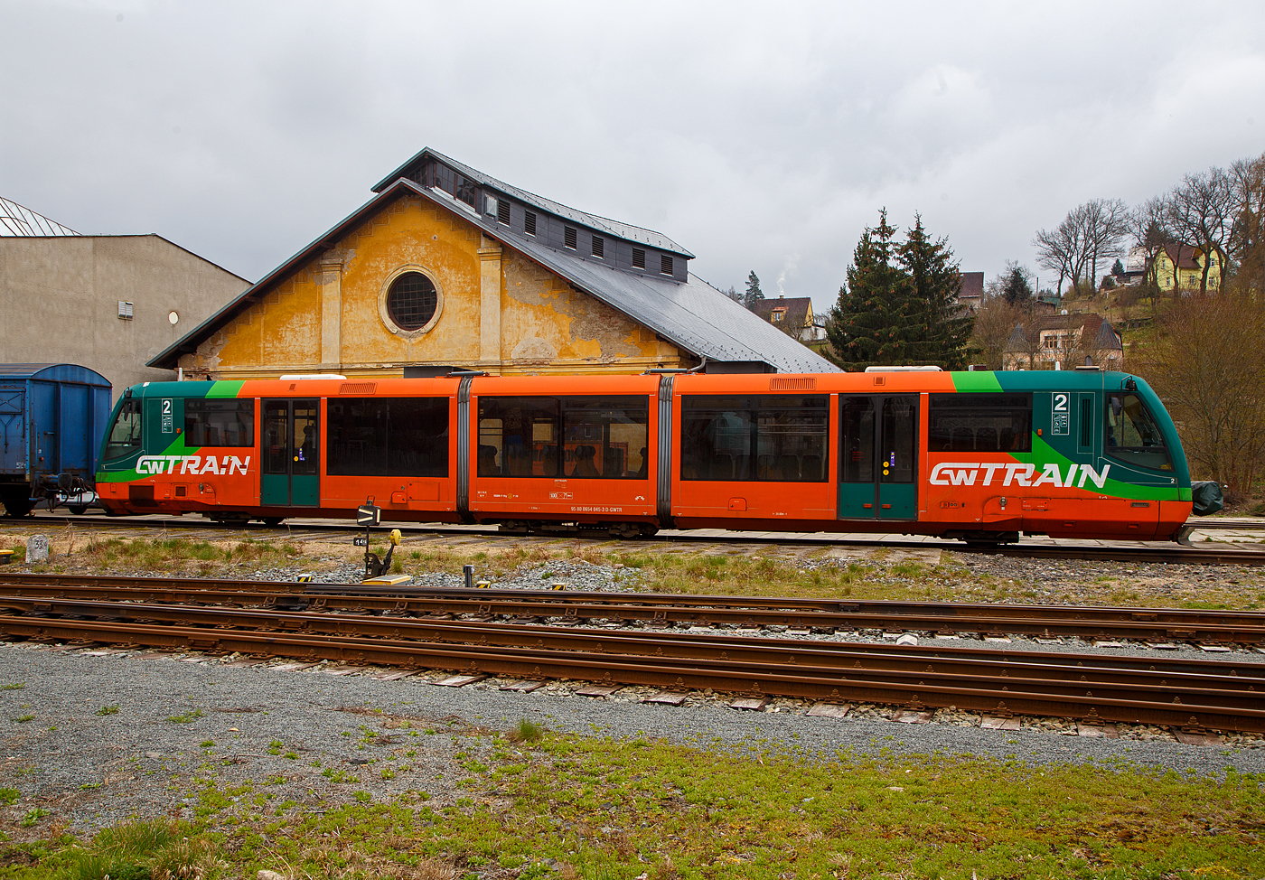 Der DUEWAG RegioSprinter 654 048-7 (95 80 0654 048-7 D-GWTR) der GW Train Regio a.s., ex VT 48 „St. Ulrich Weischlitz“ (95 80 0654 048-7 D-DLB) der Die Länderbahn, am 20.04.2023 beim Bahnhof Bečov nad Teplou (Petschau).