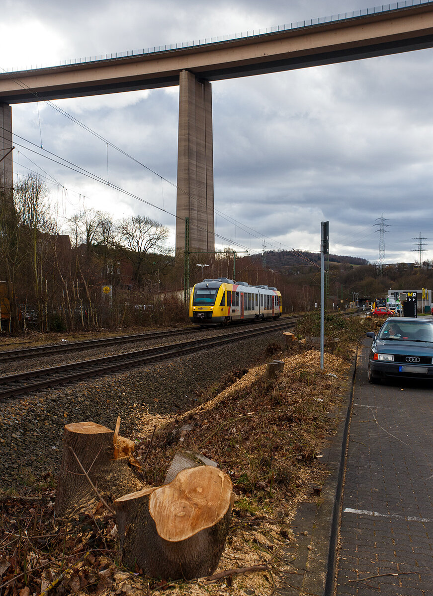 Der VT 261 (95 80 0648 161-7 D-HEB / 95 80 0648 661-6 D-HEB) ein Alstom Coradia LINT 41 der HLB (Hessische Landesbahn), hat am 28 Februar 2026, als RB 90  Westerwald-Sieg-Bahn  (Altenkirche - Au/Sieg – Siegen) den Bahnhof Eiserfeld verlassen und fährt seinem Ziel den Hauptbahnhof Siegen entgegen.