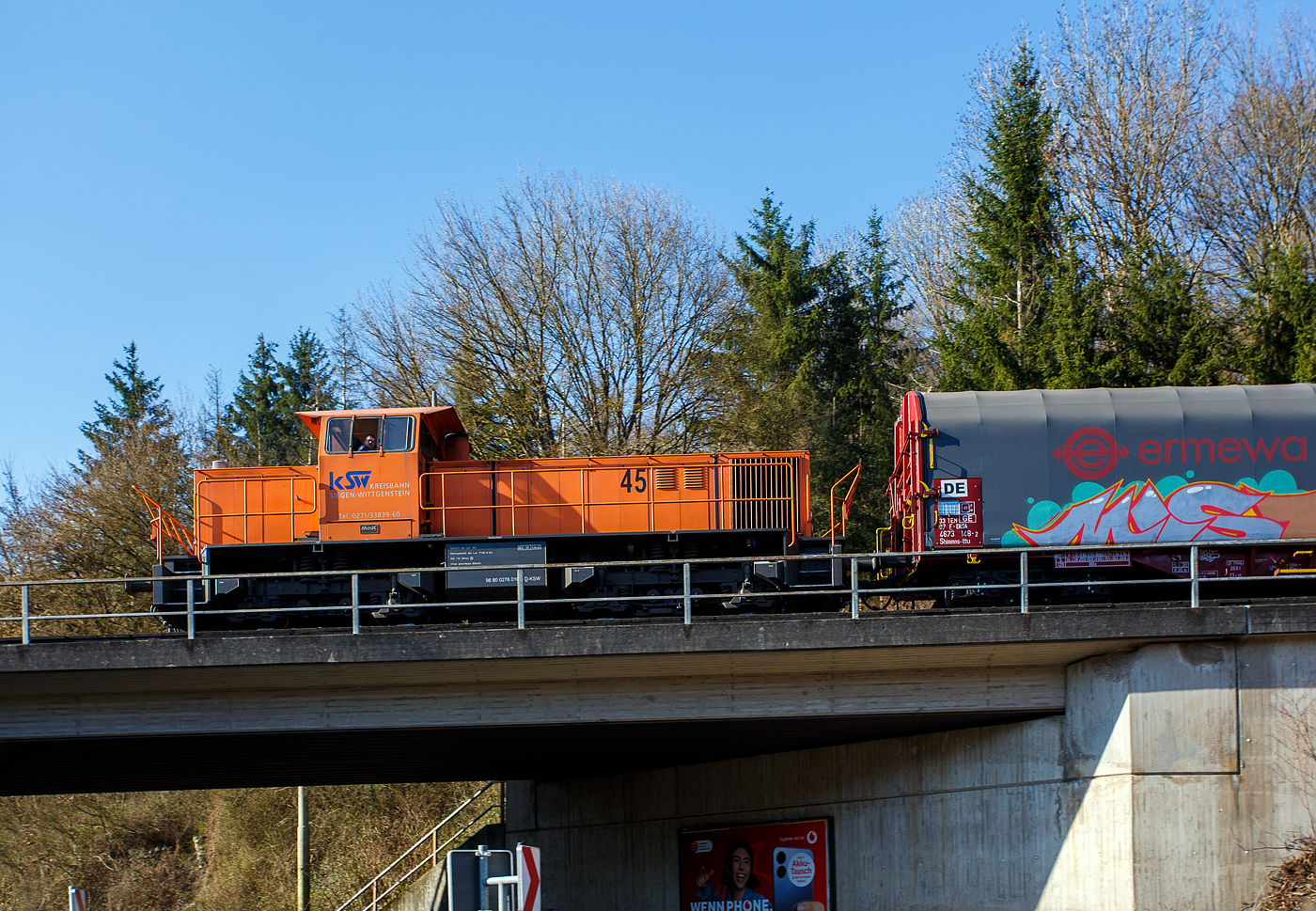 Die KSW 44 (92 80 1271 004-4 D-KSW) eine MaK G 1000 BB der KSW (Kreisbahn Siegen-Wittgenstein) am 03 Februar 2026 auf dem KSW-Rangierbahnhof in Herdorf, Betriebsstätte FGE -Freien Grunder Eisenbahn.