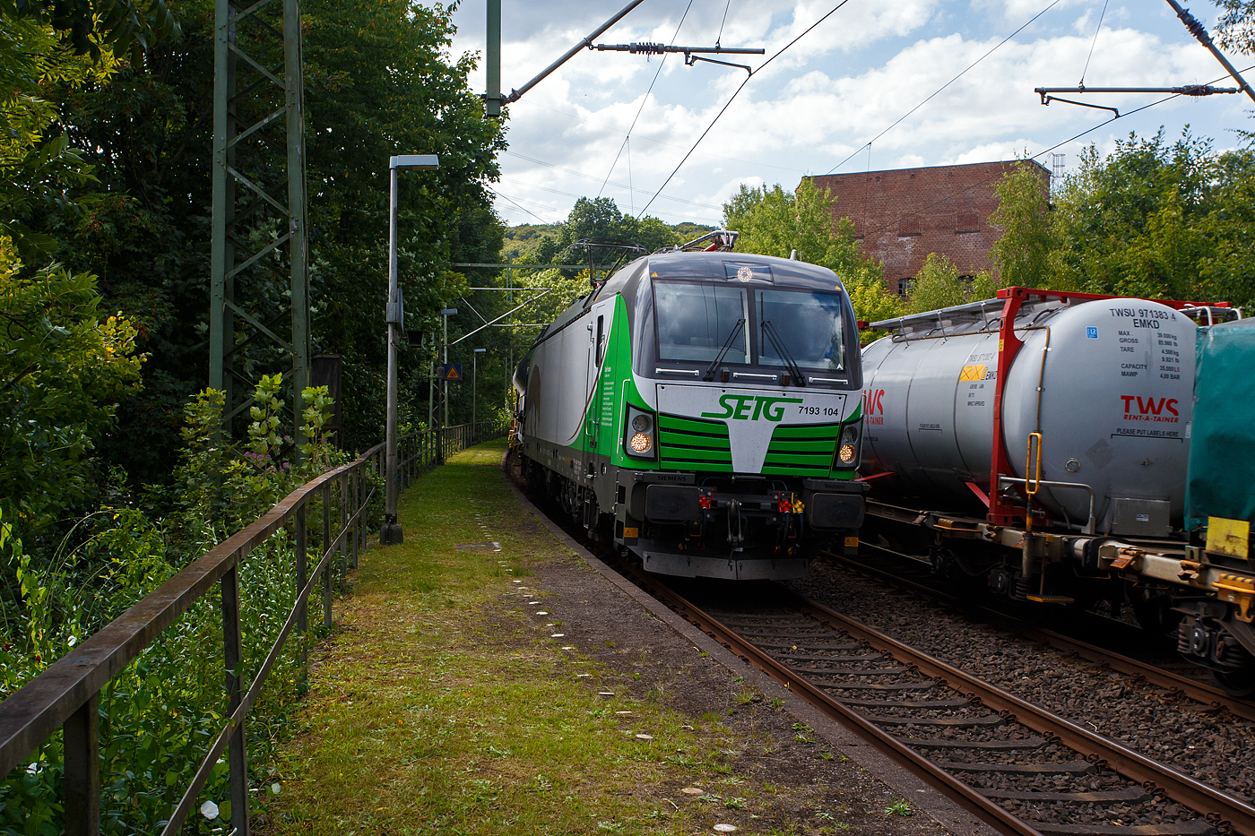 Die RHC DE 501 alias 4185 017-5 (92 80 4185 017-5 D-RHC) eine Vossloh DE 18 der RheinCargo fährt am Sonntag den 07.07.2019 mit einem Kalkzug (4-achsige Trichtermittenentladewagen der Gattung Tadns) durch Betzdorf/Sieg in Richtung Siegen.