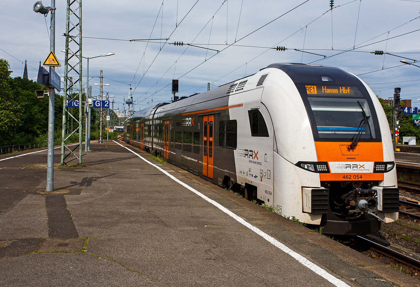 Zwei gekuppelte vierteilige Siemens Desiro HC 462 054 und 462 038 des RRX Rhein-Ruhr-Express (betrieben vom der National Express), fahren am 26 Mai 2024, als RRX RE 1 „NRW-Express“ (Aachen – Köln – Düsseldorf – Duisburg – Essen – Dortmund - Hamm/Westf.), in den Bahnhof Köln Messe/Deutz ein. Aufgrund der Insolvenz von Abellio Rail NRW ist seit Februar 2022 National Express der Betreiber aller Linien im RRX-Vorlaufberieb.