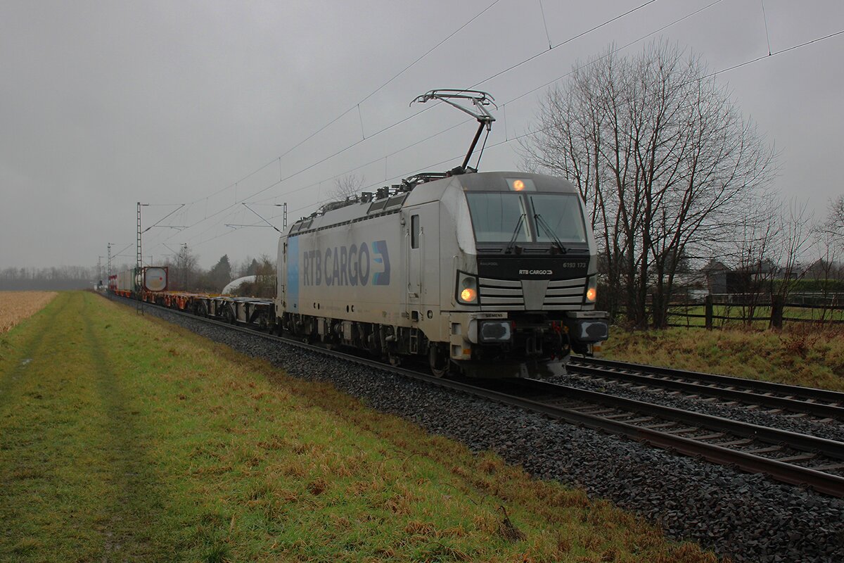 RTB Cargo 193 173 zieht ein etwa für 1/3 beladener Containerzug durch Kaarst-Broicherseite am ganz verregneten 12.Februar 2026.