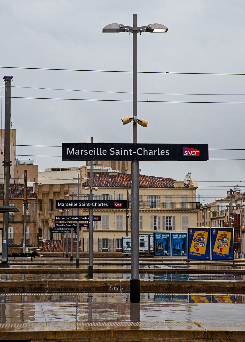 Die SNCF BB 22312 "Antibes / Juan-les-Pins" (BB 5 22312R bzw. UIC: F-SNCF 91 87 0022 312-) hat am 25 März.2015 mit einem TER Regionalzug den Bahnhof Marseille-Saint-Charles erreicht. Es regnete Bindfäden.