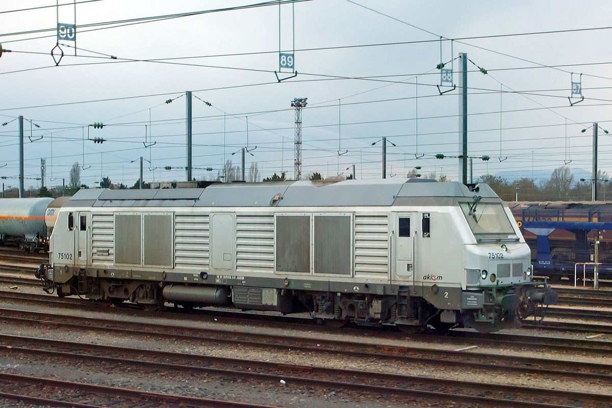 Die Akiem BB 75 326 (92 87 0075 326-4 F-AKIEM), ex Akiem 75026, ex Fret SNCF 475026, ist am 24.03.2015 bei Muhlhouse (Mülhausen) abgestellt. Die Aufnahme konnte ich aus unserem Zug (TGV) heraus machen.