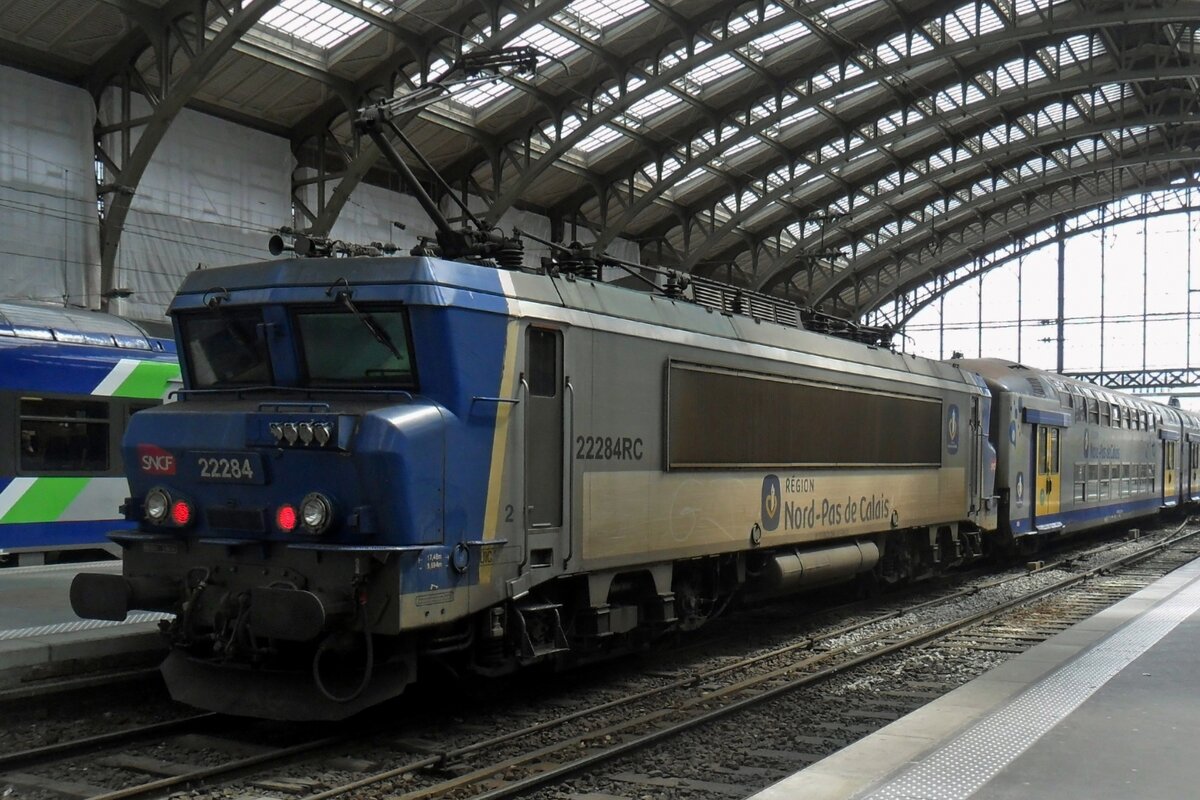 SNCF 22265 tragt am 20 September 2023 die "Nord-Pas-de-Calais" Aufkleber und steht in Lille-Flandres mit ein Regionalzug nach Maubeuge. Leider drángt das Zeitalter der nez-cassé Lokomotiven in Frankreich zum Ende.