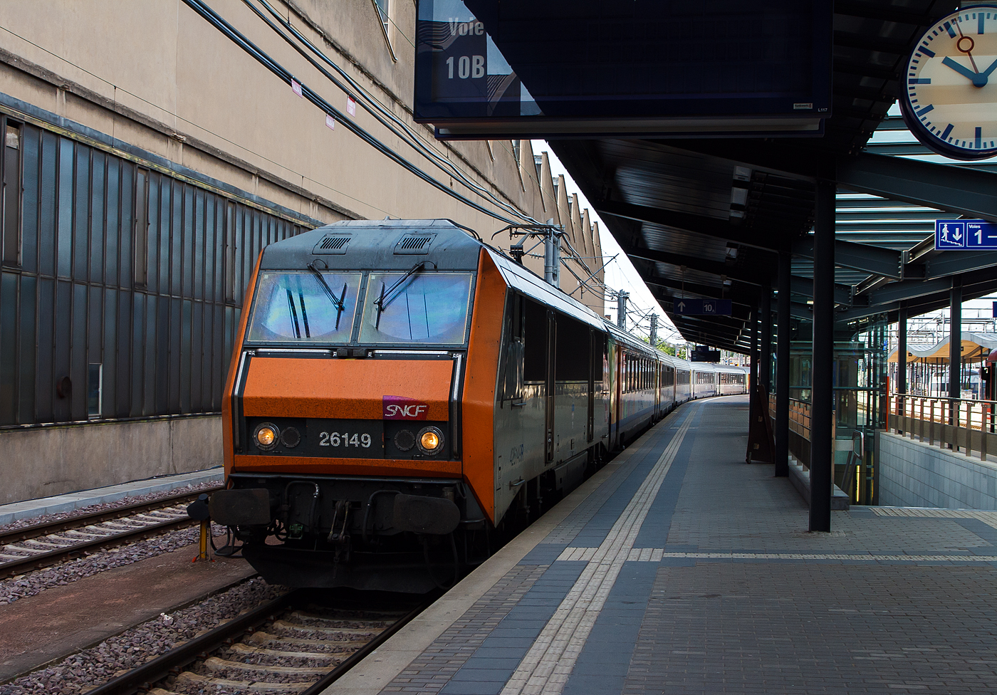 Die SNCF BB 26159 "Sybic" (91 87 0026 159-x F-SNCF) erreicht am 14 Juni 2013, mit dem Eurocity EC 90 „Vauban“ (Chur – Zürich – Basel – Straßburg – Luxemburg – Brüssel), den Bahnhof Luxemburg Stadt. Den Zug wird dann gleich hier die NMBS/SNCB HLE 2005 mit 2 weiteren belgischen Reisezugwagen übernehmen.