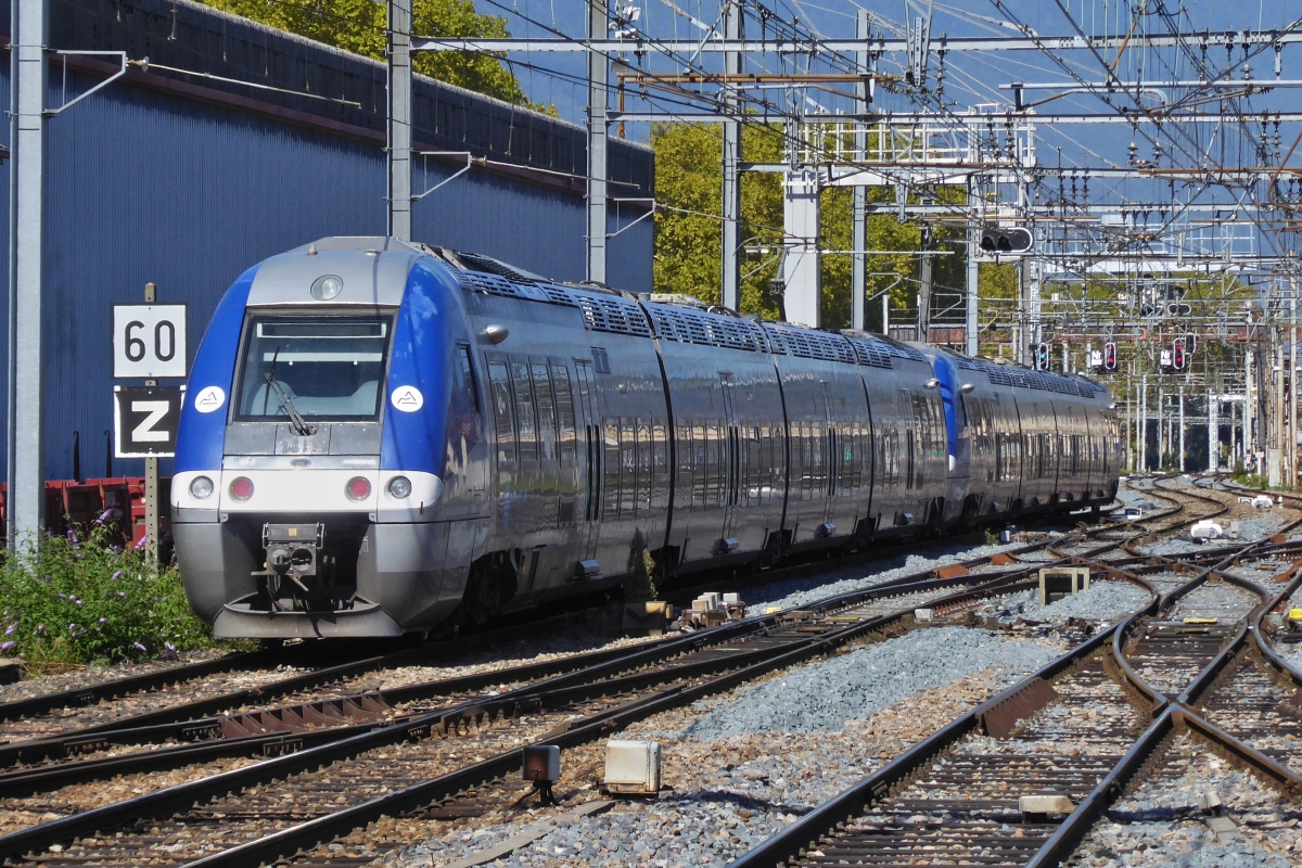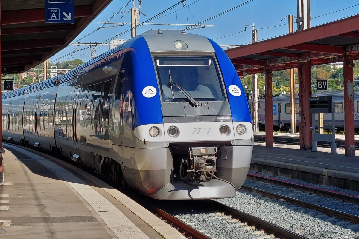 AGC-BGC Bimodal-Hybrid 82727 fährt mit gesenktem Stromabnehmer in den Bahnhof von Chambéry - Challes les Eaux ein, beim Halt am Bahnsteig wurde der Stromabnehmer hochgefahren. 21.09.2022 (Jeanny) Hans und Jeanny De Rond
