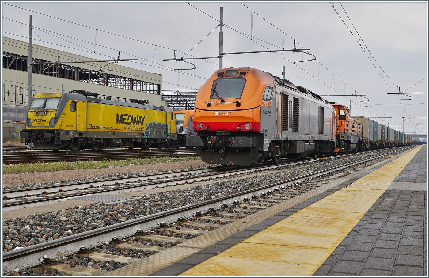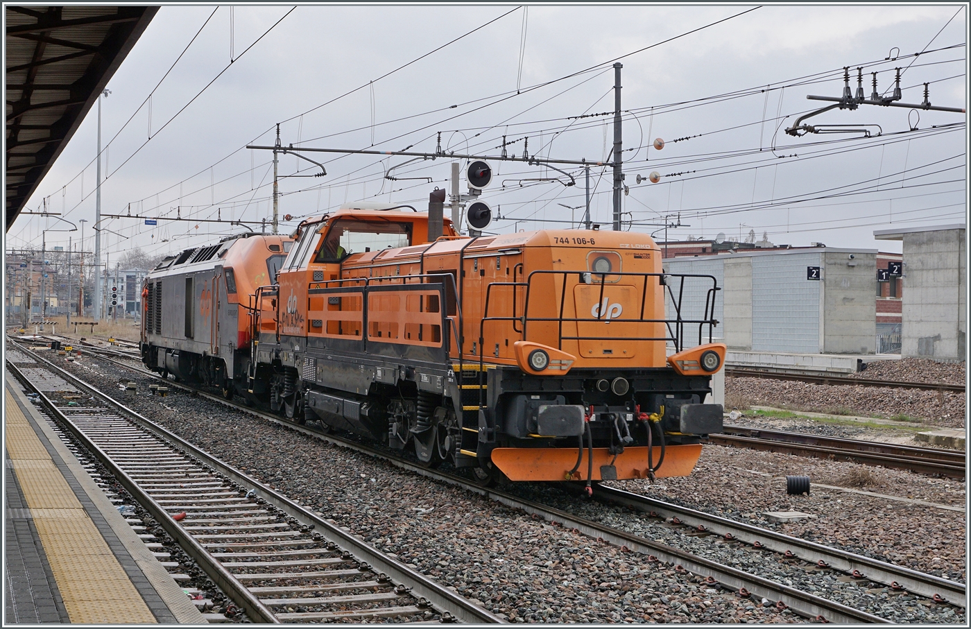 Von der Dinazzano Pò (DPO) Eurolight D 284 002 (UIC 92 83 2284 002-8 I-DPO) geschoben, wird die D 744 006 (UIC 92 83 2744 006-3 IT-DPO) in Reggio Emilia rangiert.