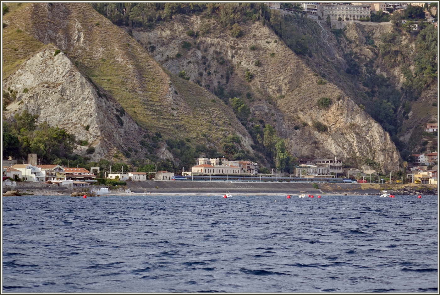 Praktisch an der selben Stelle wie beim vorangehenden Bild entstand dieses Foto: die FS Trenitalia E 464.231 (und die E 464.350 am Zugschluss) sind mit dem ICN 1959 von Roma Termini (23.25) nach Siracusa (an 12:52) unterwegs und haben pünktlich den Bahnhof von Taormina-Giardini erreicht.
