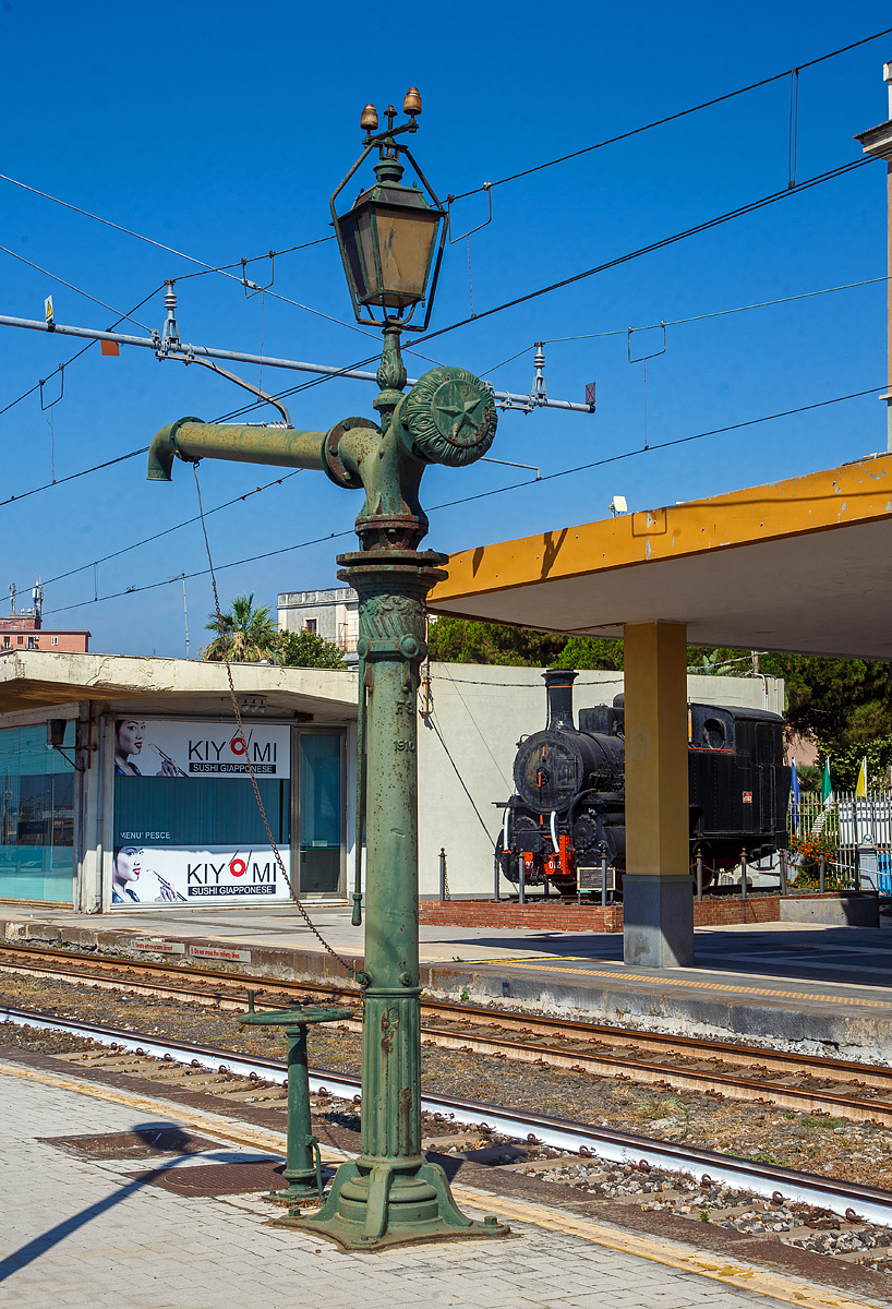 Der Wasserkran im Bahnhof Tirano am 14.09.2017, dahinter steht die Tigre / Tiger E.652 034-6 (91 83 2652 034-6 I-MIR) der Mercitalia Rail Srl mit einem Mineralwasserzug. Die Mercitalia Rail Srl, eine 100%tige Tochter der Ferrovie dello Stato Italiane (FS, deutsch Italienische Staatseisenbahnen).