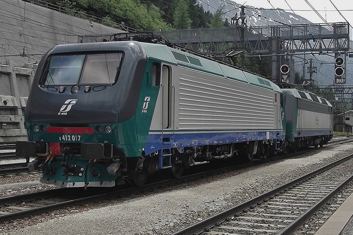Leider sehr beschmiert.... In Doppeltraktion fahren zwei Brennerloks (ex Trenitalia E.412) am 26.03.2022 als Lokzug vom Brenner hinab kommend durch den Bahnhof Gossensaß/Colle Isarco in Richtung Bozen. Nochmal einen lieben Gruß an den netten Lokführer zurück. Vorne die E412 005 (91 83 2412 005-7 I-MIR) und dahinter die E412 018 (91 83 0412 018-4 I-MIR), beide gehören heute zur Mercitalia Rail Srl., die aber auch eine 100%tige Tochter der Ferrovie dello Stato Italiane (FS, deutsch Italienische Staatseisenbahnen) ist. Sie betreibt heute die Güterverkehrssparte. Beide wurden 1997 vom damaligen Hersteller ABB Tecnomasio in Vado Ligure (Italien), später Bombardier, heute Alstom, gebaut und an die Trenitalia S.p.A. geliefert. Die E.412 005 unter der Fabriknummer 7420 und die E.412 018 unter der Fabriknummer 7433. Die Brennerloks vom Typ Adtranz 112E sind ähnlich denen später von Bombardier (2001/2) gebauten 8 Loks für die polnische PKP - Polskie Koleje Państwowe vorgesehen EU43 vom Typ Bombardier 112E. Der Verkauf scheitere aus finanziellen Gründen seitens der PKP. Die 8 polnischen Loks sind danach an die italienische Privatbahngesellschaft RTC (Rail Traction Company) verkauft worden, die polnische Bezeichnung EU43 wurde später an Lokomotiven der TRAXX-Variante MS2 vergeben. Ursprünglich war für beide Baureihen die Zulassung für Österreich und Deutschland vorgesehen. Die ÖBB hatte zunächst die Zulassung verweigert und erst 2006 erteilt. Geschichte: Im Jahr 1993 gaben die FS im Zuge der wachsenden internationalen Aktivitäten der europäischen Bahngesellschaften Mehrsystemlokomotiven in Auftrag, die sowohl im italienischen 3-kV-Gleichstromnetz als auch im Süden von Frankreich (1,5 kV =) und insbesondere für den Brennerverkehr auch im österreichischen und deutschen Netz (15 kV, 16,7 Hz) einsetzbar sein sollte. Die Lokomotiven sollten sowohl für schnelle EuroCity-Züge als auch für den Güterverkehr einsetzbar sein. Die vier Prototyp-Lokomotiven wurden ab 1996 vom damaligen Hersteller ABB Tecnomasio (heute Alstom) in Vado Ligure, Italien, gebaut. Dieses Werk produziert nahezu ausschließlich für den italienischen Markt. Technik: Die Lokomotiven laufen auf Drehgestellen mit Integriertem Gesamtantrieb (IGA), der auch bei den Lokomotiven der DB-Baureihe 101 und den italienischen E405 vorhanden ist, die Stromrichter ähneln denen der SBB Re 460. Für den Antrieb werden Doppelsternmotoren verwendet, was Drehstrom-Asynchronmotoren mit zwei Wicklungssystemen in Sternschaltung im selben Gehäuse sind – eine eher unübliche Schaltung. Der geschweißte Wagenkasten in Stahlleichtbaukonstruktion stützt sich über Flexicoil-Schraubenfedern auf die Drehgestelle ab. Die Seitenwände aus Aluminium sind zur Erhöhung der Steifigkeit gesickt. Der estergekühlte Transformator ist wie bei Neubaulokomotiven üblich unterflur angeordnet. Die Lokomotive ist mit Gruppenantrieb ausgeführt, wobei eine Antriebsgruppe aus einer Achse aus dem Drehgestell 1 und einer aus dem Drehgestell 2 besteht, eine ebenfalls unübliche Anordnung. Die Lokomotiven verfügt über eine elektrische Nutzbremse. Es sind zwei Einholmstromabnehmer der Bauart WBL 85 vorhanden, je einer für Gleichspannung (Führerstand A, italienische Palette) und Wechselspannung (Führerstand B, deutsch-österreichische Palette). In der Lokomotive sind zwei Stromrichter angeordnet. Unter Wechselstromsystemen wird die sekundärseitige Spannung des Haupttransformators in einem Vierquadrantensteller (4QS) in eine Gleichspannung umgewandelt, welche in einen Gleichstromzwischenkreis eingespeist wird. Unter den Gleichstromsystemen erfolgt die Speisung des Zwischenkreises direkt aus der Fahrleitung. Die Pulswechselrichter wandeln den Gleichstrom des Zwischenkreises in Dreiphasenwechselstrom zur Speisung der Fahrmotoren um. Im Gleichstromnetz sind zwei Pulswechselrichter in Serie geschaltet, die je ein Wicklungssystem der Fahrmotoren mit Strom versorgen, im Wechselstromsystem wird nur ein Pulswechselrichter benötigt, der die beiden parallel geschalteten Wicklungssysteme der Fahrmotoren mit Spannung versorgt. Die Steuerung der Antriebe erfolgt durch ein rechnerunterstütztes Betriebssystem. Die Lokomotiven sind mit 18-poligen IS-Steckdosen für die UIC-Leitung, einer Vielfachsteuerung und einer Speiseeinrichtung der Zugsammelschiene für Reisezüge ausgerüstet. Lauftechnisch sind die Lokomotiven für eine Geschwindigkeit von 220 km/h ausgelegt, jedoch in Italien nur für 200 km/h zugelassen. Ausgerüstet wurden sie mit Fahrzeugeinrichtungen der Zugbeeinflussungen RS4 Codici (Italien) sowie punkt- und linienförmiger Zugbeeinflussung (Österreich und Deutschland). Von einem Einsatz in Frankreich wurde abgesehen. Die E 412 wurden mit dem damals üblichen XMPR-Anstrich der FS ausgeliefert, werden seit 2021 aber im Rahmen von Hauptuntersuchungen auf den neuen rot-grauen Anstrich der FS-Tochter Mercitalia Rail umlackiert. TECHNISCHE DATEN: Spurweite: 1.435 mm (Normalspur) Achsformel: Bo'Bo' Länge: 19.400 mm Drehzapfenabstand: 11.400mm Achsabstand im Drehgestell: 2.650 mm Dienstgewicht: 88 t Höchstgeschwindigkeit: 150 km/h Italien / 140 km/h Deutschland / 120 km/h Österreich Dauerleistung: 5.600 kW (15 kV AC) / 5.400 kW (3 kV DC) / 2.700 kW (1,5 kV DC) Anfahrzugkraft: 280 kN Stromsysteme: 15 kV, 16,7 Hz AC, 3.000 V DC und 1.500 V DC Anzahl der Fahrmotoren: 4× IGA-Drehstrom-Asynchronmotoren Bremse: Druckluftbremse, el. Nutzbremse Zugbeeinflussung: RS 4 Codici, PZB, LZB