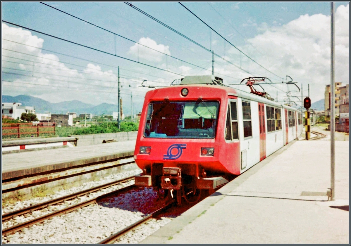 Die F.C.E. N. 14 „LA MEUSE“ der Ferrovia Circumetnea (FCE), ex V 2 der Ferrovia Alifana, steht äußerlich aufgearbeitet, neben einem Wasserkran auf einer Weiche aus der Gründerzeit, neben dem Empfangsgebäude des Bahnhofes Catania-Borgo, hier am 20.07.2022.