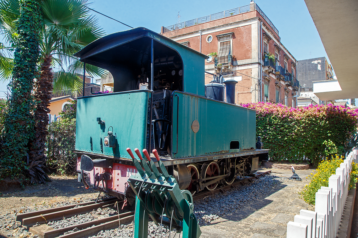 Die F.C.E. N. 14 „LA MEUSE“ der Ferrovia Circumetnea (FCE), ex V 2 der Ferrovia Alifana, steht äußerlich aufgearbeitet, neben einem Wasserkran auf einer Weiche aus der Gründerzeit, neben dem Empfangsgebäude des Bahnhofes Catania-Borgo, hier am 20.07.2022.