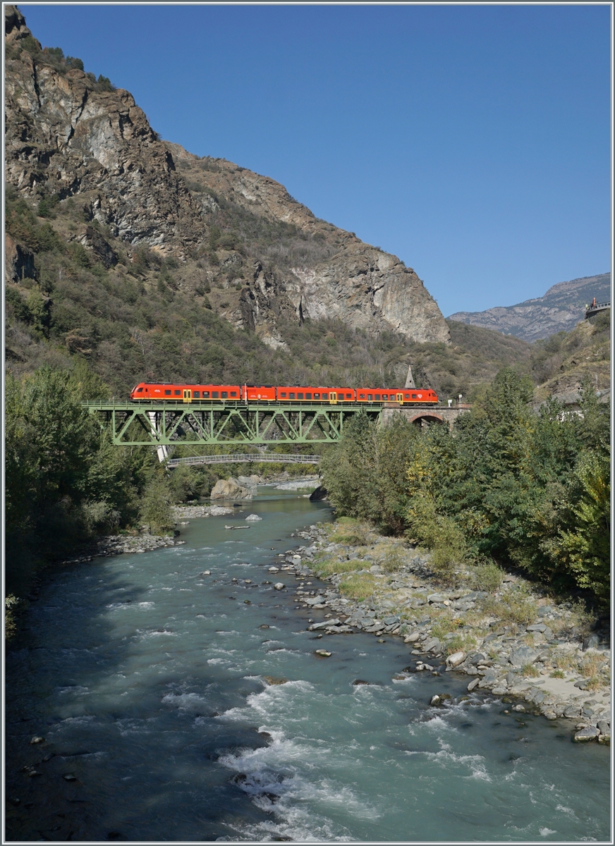 Schade - schon ist der Einsatz der BTR 813 im Aostatal (zumindest Vorübergehend) vorbei; deshalb noch ein Bild aus Chatillon Saint Vincent mit dem hier ankommenden BUM BTR 813 001 als RV VdA 2729 von Torino nach Aosta. Am linken Bildrand ist der in die Gegenrichtung fahrende Zug angedeutet.