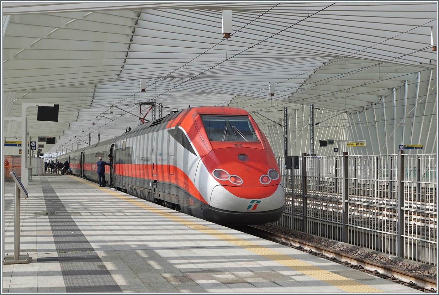 Der FS Trenitalia ETR 500 044 macht auf seiner Fahrt nach Milano einen kurzen Halt in Reggio Emilia AV. Der formschöne Bahnhof wurde vom bekannten Architekt Santiago Calatrava.