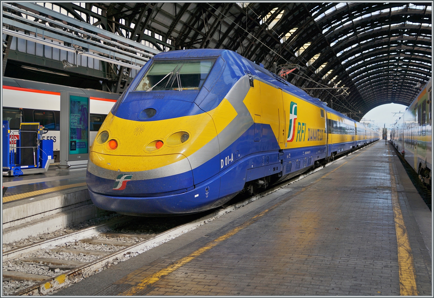 In Milano Centrale steht ein von der Form her bekannter Zug, jedoch in einer noch nie gesehenen Farbgebung: Der RFI ETR 500 mit dem Triebkopf 93 83 2404 648-2 I-RIF  Diamante 2.0 .
