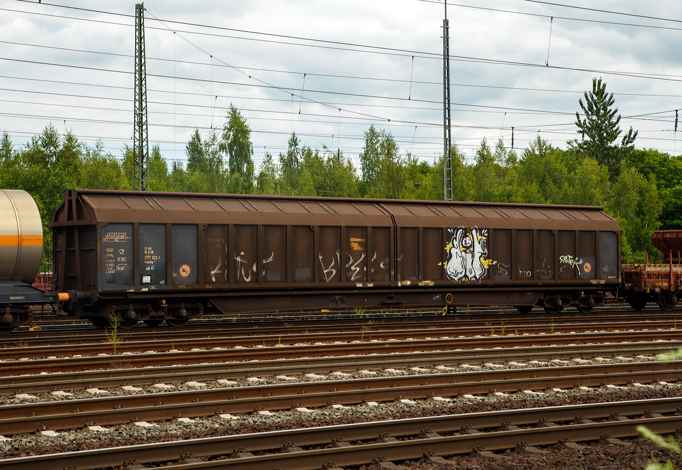 Vierachsiger, großräumiger Schiebewandwagen 31 83 2852 465-3 I-MIR, der Gattung Habillss, der Mercitalia Rail Srl am 16.03.2022 im Zugverband bei der Zugdurchfahrt in Niederschelden (Sieg). Oft wird mit diesen Wagen/Zügen Mineralwasser von Italien nach Deutschland gebracht. Die Mercitalia Rail Srl, eine 100%tige Tochter der Ferrovie dello Stato Italiane (FS, deutsch Italienische Staatseisenbahnen).