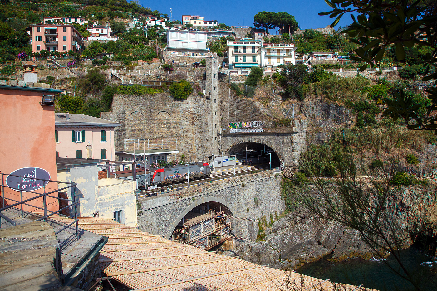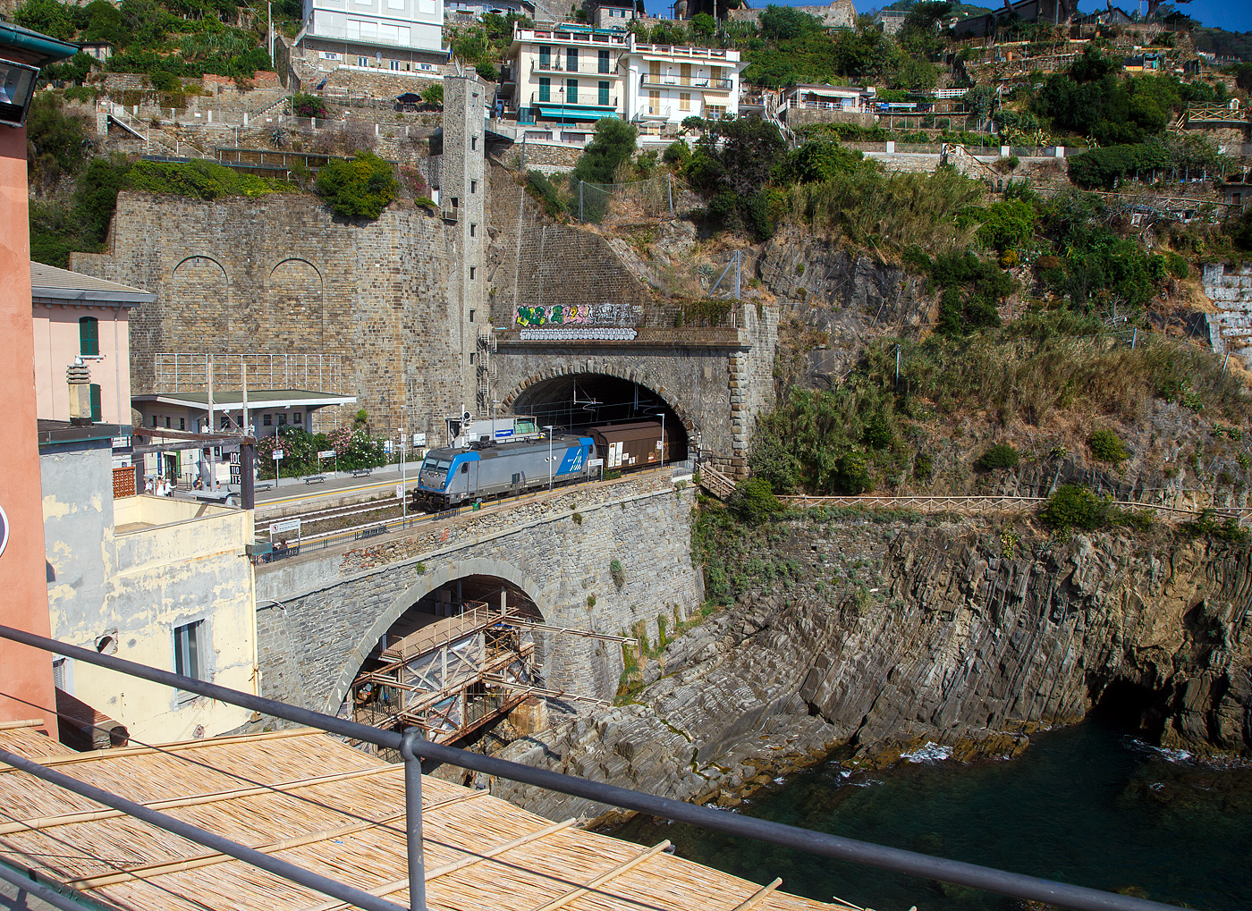 Die CAPTRAIN 494 511, eine Bombardier TRAXX F140 DC3 LM (mit Last-Mile-Modul), fährt am 22.07.2022 mit einem Kesselwagenzug durch den Bahnhof Levanto in Richtung La Spezia.
