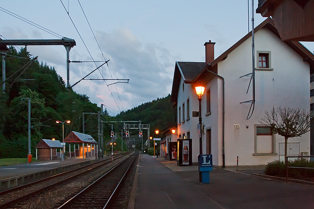 Noch ein letzter Blick auf den Bahnhof Clervaux an der Nordstrecke. Hier am 15.06.2013 (22:07 Uhr), in südlicher Blickrichtung (zum Tunnel Clerf).