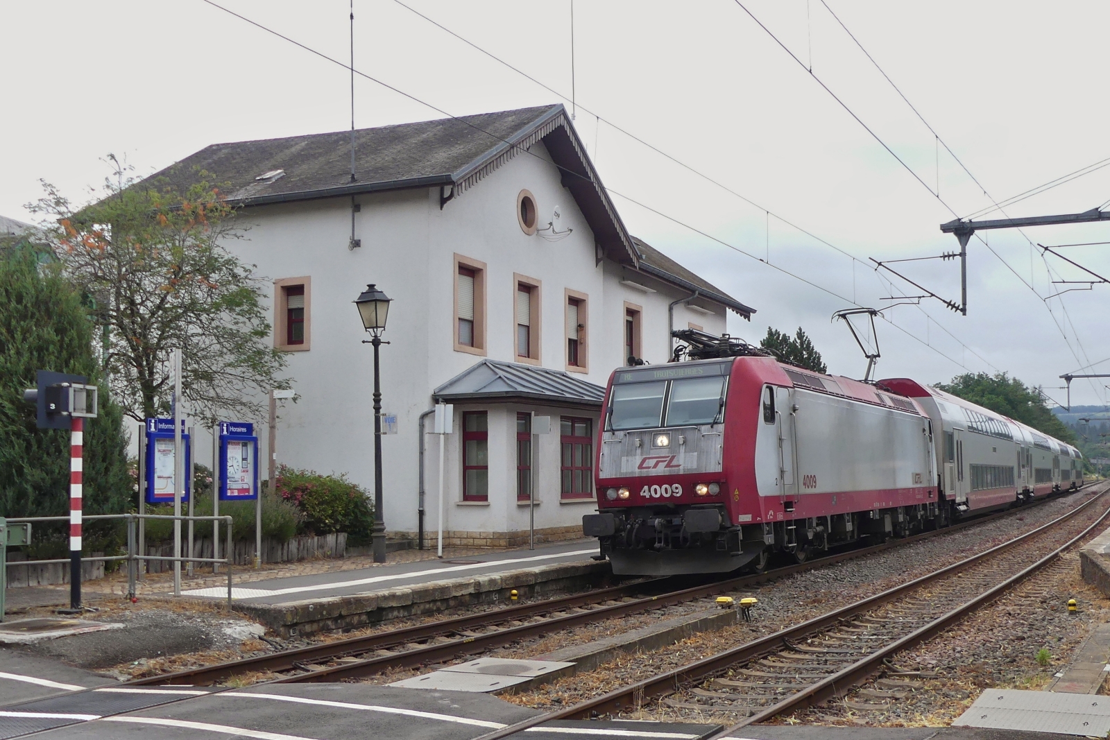 CFL DE 18 310, steht mit einigen mit Schotter gefüllten Güterwagen im Bahnhof von Wilwerwiltz. 25.08.2023