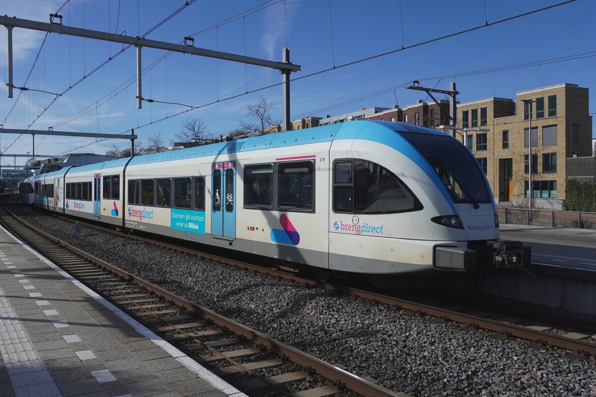 Rrreis/Arriva 379 steht am 19 März 2026 in Arnhem Centraal abfahrtbereit nach Doetinchem. Dieser Triebzug tragt noch die Farben des vorherigen Betriebers Breng.