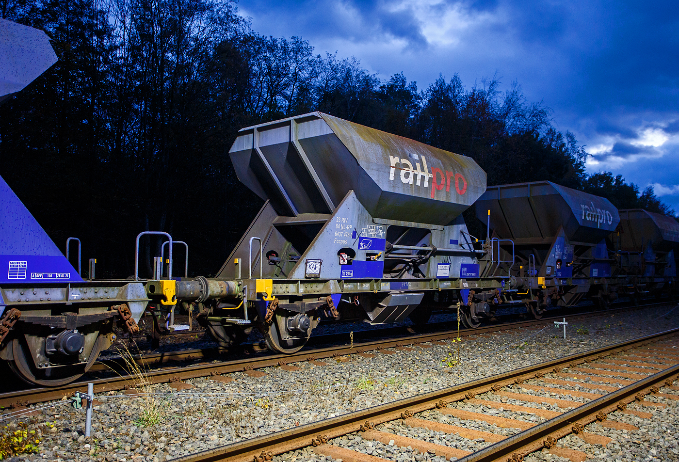 Zweiachsiger offener Schüttgutwagen mit dosierbarer Schwerkraftentladung (Schotterwagen) 23 84 6437 481-4 NL-RP, der Gattung Fccpps, der voestalpine Track Solutions Netherlands B.V. (ex voestalpine Railpro B.V.) abgestellt am frühen Abend des 26 Oktober 2025 bei der Baustelle im Bahnhof Herdorf. Diese Wagen wurden ab 1961 von Talbot in Aachen für die NS als Fcs oder als Tds gebaut. Ab 1982 wurden die Wagen von den Firmen Jansen und WBA (NL) zu Fccpps umgebaut. Die Firma "Railpro" mietete diese Wagen ab 1995 an bzw. kaufte sie 2002 von der NS und ließ sie aufarbeiten, dabei erhielten sie einen blauen Neuanstrich und den Schriftzug „railpro“. Seit 2002 gehört Railpro zur der österreichischen Voestalpine Gruppe, aktuell firmiert sie als voestalpine Track Solutions Netherlands B.V. Bei den Gleisbaufirmen sind diese Wagen äußerst beliebt, da sie sich der Schotter beim Einschottern sehr gut dosieren lässt. Außerdem ist der Auslauf (von der Gleismitte bis neben das Gleis) sehr gut verstellbar, daher lässt sich der Schotter auch sehr gut verteilen. Der Fccpps ist ein benutzerfreundlicher, Rutschenwagen, der für die Versorgung aller Arten von grobem Ballastmaterial geeignet ist. Er kann Schotter (Ballast) außerhalb und innerhalb der Schiene entladen, ohne die Schienen zu beschädigen. Mittels des Trichters kann sowohl innerhalb als auch außerhalb der Gleise entladen werden. Die Trichter ermöglichen eine dosierbare Entladung. Bei minimalem Kraftaufwand, kann der Bediener dank eines Handhebels, der sich mühelos öffnen und schließen lässt, eine Menge von 28,2 Tonnen Schotter kontrolliert in der Schiene freisetzen. Die maximale Transportdichte über Puffer beträgt 2,93 Tonnen pro Meter. Auf der Arbeitsplattform, welche ca. 2 Meter von den Rutschen entfernt ist, können zwei Bediener gleichzeitig den Ballast auf beiden Seiten der Strecke entladen. Sämtliche Fccpps-Waggons von voestalpine Railpro sind mit einer Schalldämpfung (gummiert) in der Auslaufrinne ausgestattet, um die Umgebung aber vor allem, die Bediener und Gleisbauer vor Lärm zu schützen. TECHNISCHE DATEN: Hersteller: Waggonfabrik Talbot in Aachen Baujahr: ab 1961 / Umbau ab 1982 Spurweite: 1.435 mm (Normalspur) Anzahl der Achsen: 2 Länge über Puffer: 9.640 mm Achsabstand: 6.000 mm Eigengewicht: 10.390 kg Ladevolumen: 22 m³ Max. Ladegewicht: 28.200 kg (ab Streckenklasse C) Höchstgeschwindigkeit: 100 km/h (beladen) 120 km/h (leer) Bauart der Bremse: O-GP (LL) Bremssohle: IB 116 Handbremse: keine Intern. Verwendungsfähigkeit: RIV
