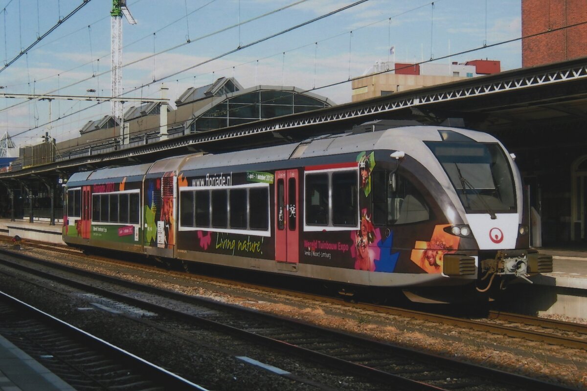 Veolia 202 steht mit Vollwerbung für  Floriade 2012  am 4 Augustus 2012 in Nijmegen. Jede zehn Jahre gab es diese Gartenschau in die Niederlände -bis 2022, wann die letzte Floriade in Aalsmeer eine Defizit von etwa 50 Millionen Euros aufwies, und damit die Floriadetradition beendete.