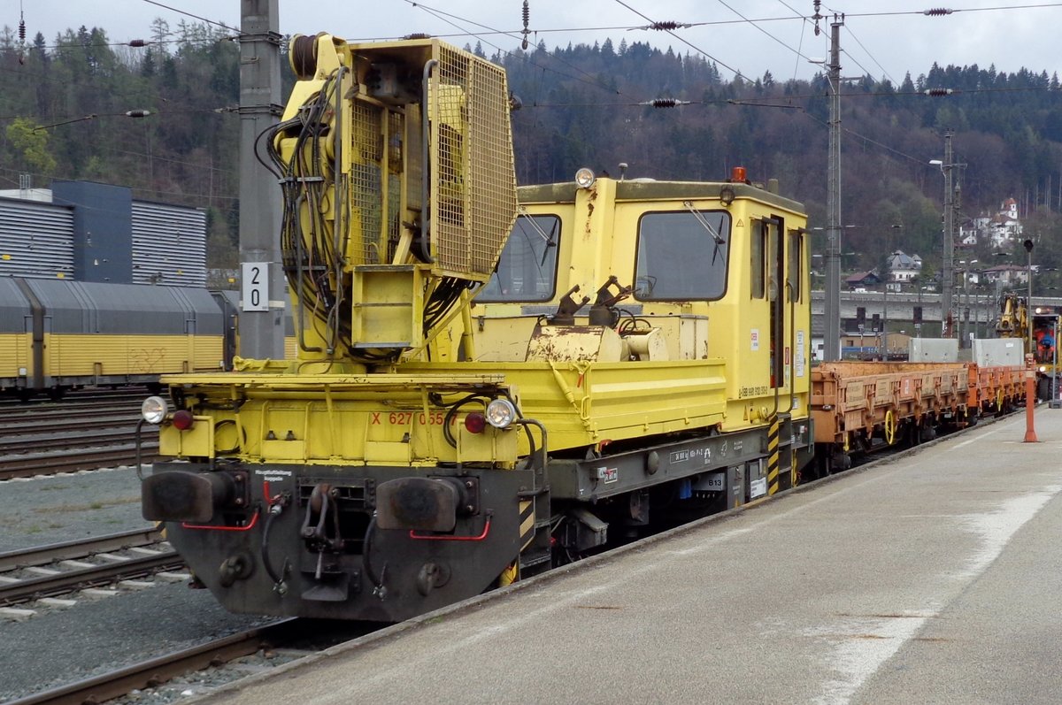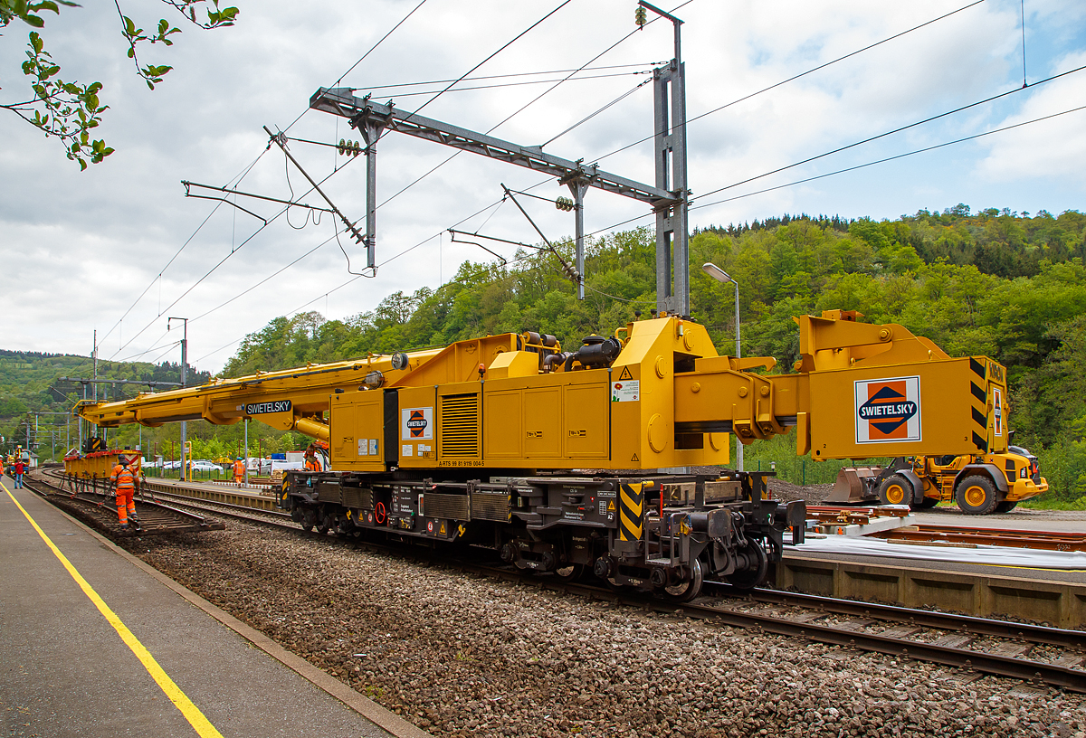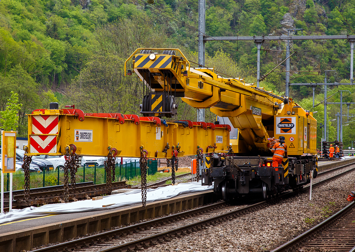 Der 150 t Kirow Gleis- und Weichenbaukran KRC 1200 (ein Kirow MULTI TASKER KRC 1200) A-RTS 99 81 9119 004-5, ex SKL X 980 009-5, der Firma Swietelsky (eigestellt durch die Tochtergesellschaft RTS Rail Transport Service GmbH) hat die 50 t-Traverse (Eigengewicht 5600) im Hacken, an dieser befindet sich ein alte Gleisstück und wird am 14.05.2016 im Bahnhofsbereich von Kautenbach aus dem Schotter gehoben.