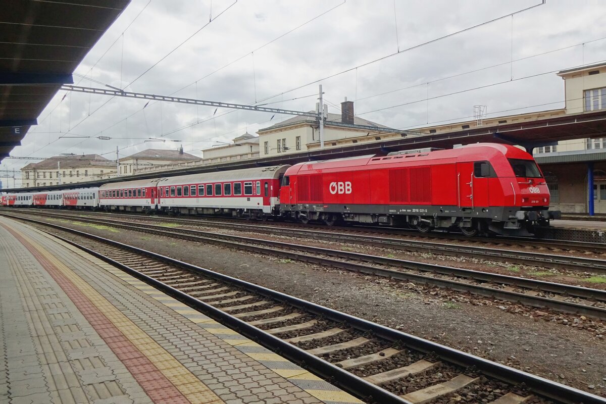 ÖBB 2016 001 schiebt ihrem Zug aus dem Bahnhof von Bratislava in Richtung Abstellung. 05.06.2023