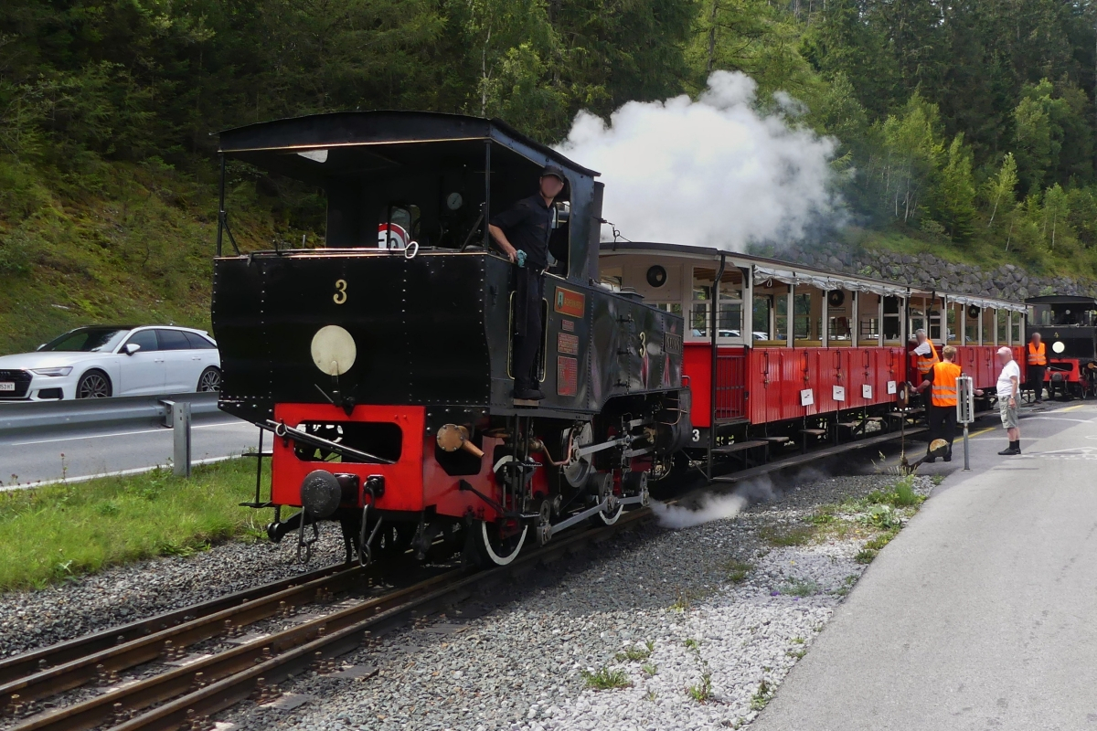 Dampflok 3 der Achenseebahn steht mit ihrem Zug in der Haltestelle Seespitz am Achensee, das Schiff mit den Passagieren legt am Steg an, somit heißt es Einsteigen um einen guten Platz zu erhaschen, der vordere Wagen ist reserviert für die Fahrgäste vom Schiff. 22.08.2024.