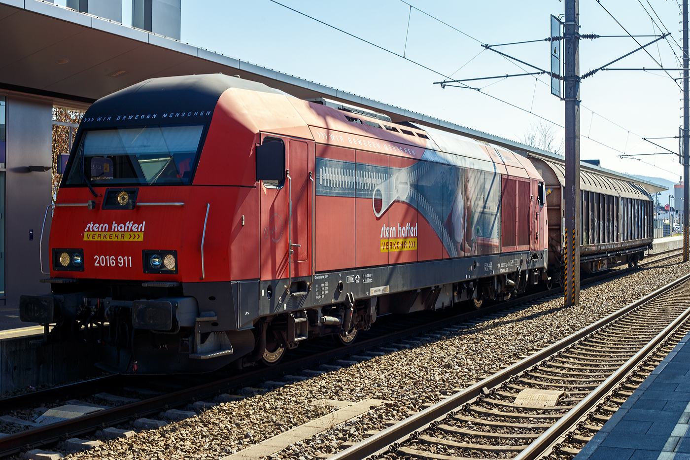 Die E-Lok E 20 006² (A-STH 91 81 1943 001-8) der der Stern & Hafferl Verkehrsgesellschaft m.b.H. (StH), ex SLB E 64, ex SAKOG E 27 001, ist am 04 April 2025, mit einem Güterzug, beim Bahnhof Vorchdorf-Eggenberg abgestellt.