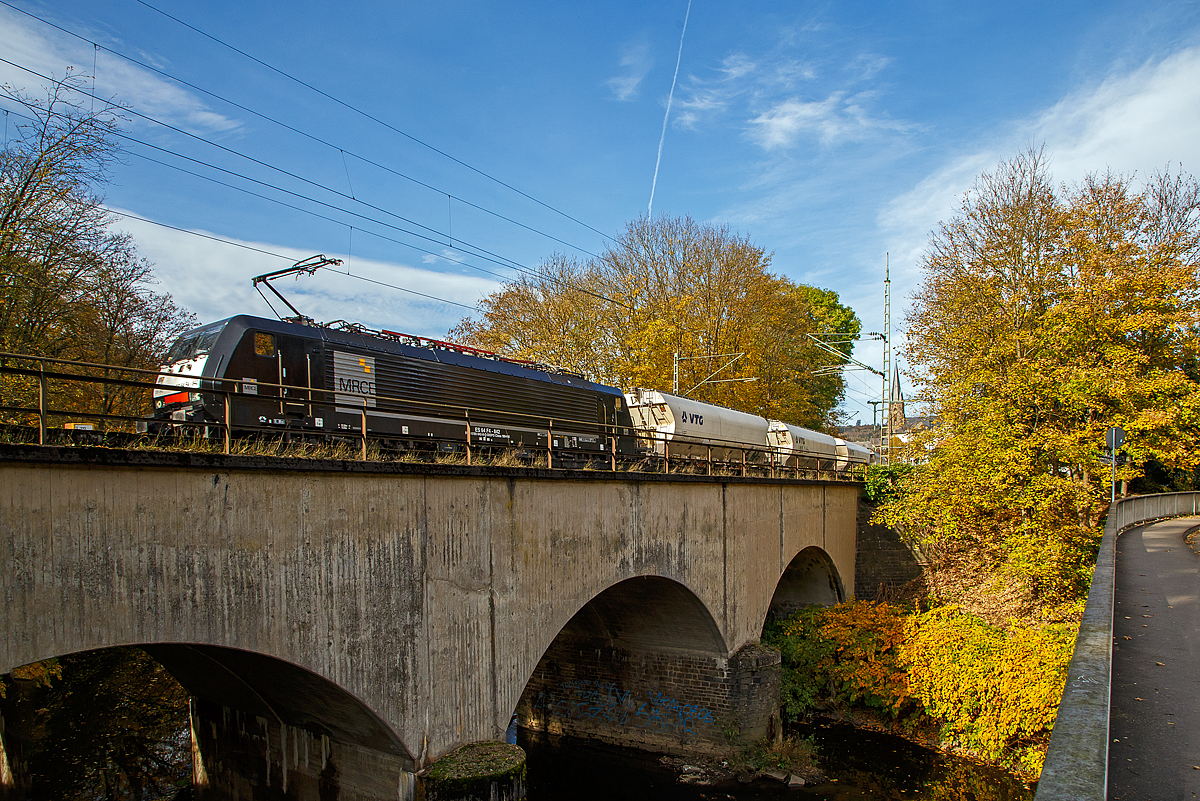 Die an die Retrack (ein Tochterunternehmen der VTG) vermietete MRCE Dispolok E 189-842 bzw. ES 64 F4 - 842 oder 189 842-8 (91 80 6189 842-8 D-DISPO Class 189-VM) fährt am 29.10.2021 mit einem Zuckerzug (VTG Trichtermittenentladewagen der Gattung Uagnpps) in Kirchen (Sieg) über die Siegbrücke in Richtung Betzdorf bzw. Köln.