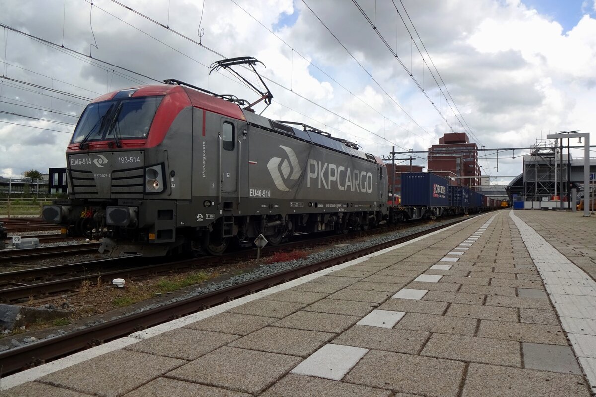 Am 1 Augustus 2020 schleppt PKP Cargo International EU46-515 ein Containerzug (vielleicht gefüllt mit Mundmasken) durch Alverna.