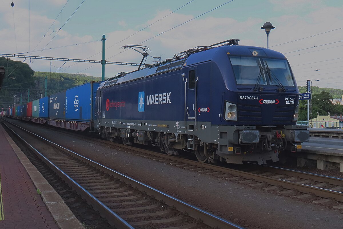 CargoUnit 5 370 037 'WOITEK' verlasst am Abend von 27 Mai 2025 Decin lh.n. mit ein Ceska-Trebova KLV von Metrans.