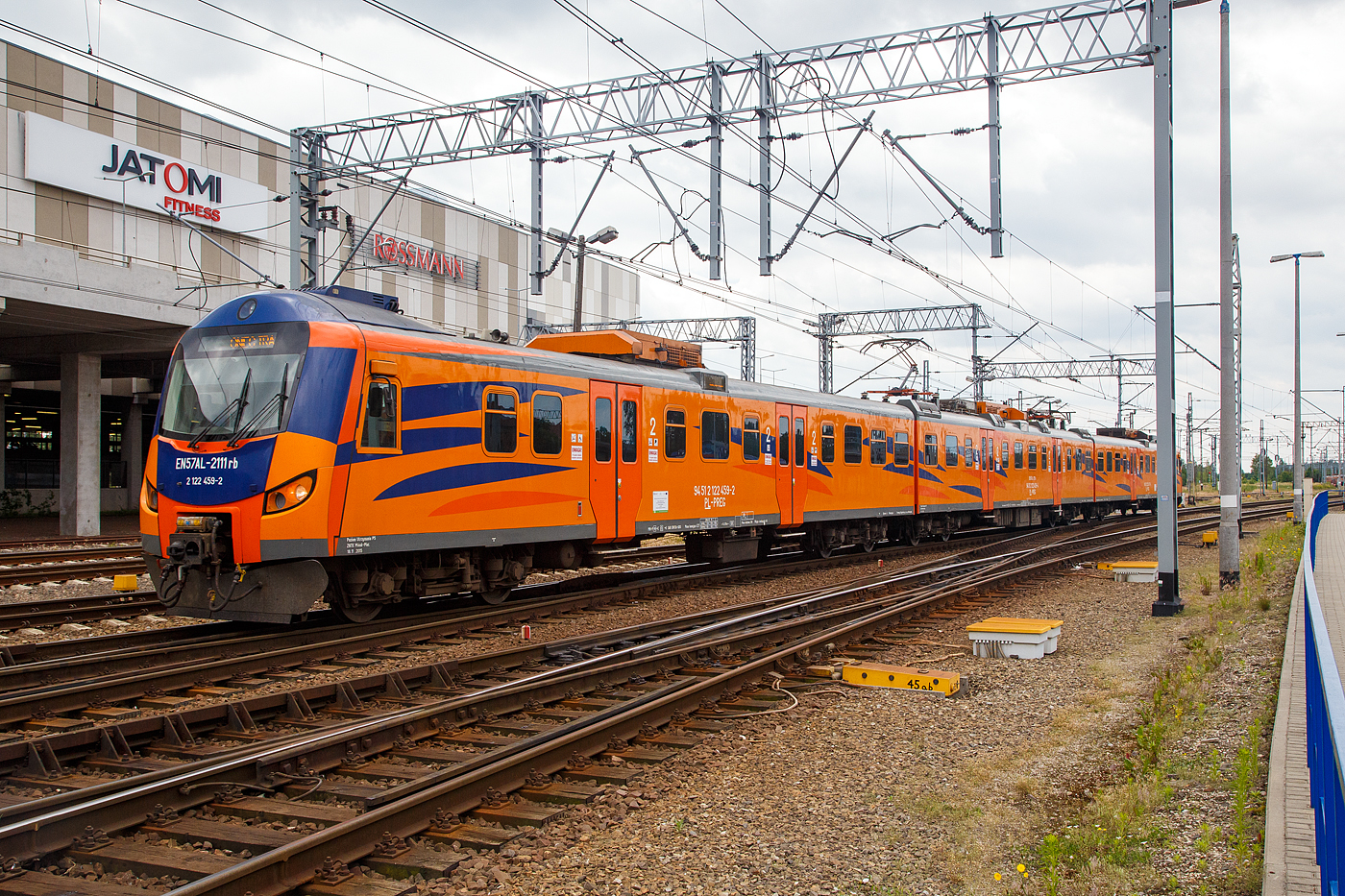 Der EN57AL-2111 (94 51 2 122 457-6 PL-PREG / 94 51 2 122 458-4 PL-PREG und 94 51 2 122 459-2 PL-PREG) ein modernisierter Triebzug vom Typ Pafawag 5B/6B der POLREGIO (Przewozy Regionalne Sp. z o.o.), ex EN57-1685, fährt am 25.06.2017 vom Hauptbahnhof Posen (Poznań Główny) in den Abstellbereich. Der Triebzug wurde 1987 von PaFaWag in Wrocław unter der Fabriknummer 563 gebaut und als EN57-1685 an die PKP geliefert, seit 2008 bei der POLREGIO wurde er 2015 modernisiert und in EN57AL-2111 umbenannt. Die Baureihe EN57 ist eine Baureihe dreiteiliger elektrischer Triebwagen ursprünglich der Polnischen Staatsbahnen (PKP). Seitdem der Nahverkehr aus diesen herausgelöst wurde, fahren sie für die jeweilige Nachfolgegesellschaft, hauptsächlich Przewozy Regionalne, teilweise (wie hier) erheblich modernisiert. Die Elektrischen-Triebzüge EN57 bestehen aus einer festen Konfiguration von drei Fahrzeugteilen, zwei Steuerwagen (Herstellerbezeichnung 5B) und einem Triebwagen (Herstellerbezeichnung 6A) dazwischen. Scharfenbergkupplungen an den Enden ermöglicht das Zusammenkuppeln mehrerer Triebzüge. TECHNISCHE DATEN: Nummerierung (Auslieferzustand): 001–130; 601–1828; 1900–1953 Gebaute Anzahl: 1412 Hersteller: PaFaWag in Wrocław Baujahre: 1961–1993 Spurweite: 1.435 mm (Normalspur) Achsformel: 2'2'+Bo'Bo'+2'2' Länge über Kupplung: 64.970 mm Breite: 2.880 mm Höhe: 3.720 mm Treibraddurchmesser: 1.000 mm Laufraddurchmesser: 920 mm Dienstgewicht: 126,5 t Höchstgeschwindigkeit: 110 km/h erste Serie, später 120 km/h Leistung: 4×145 kW (1.Serie) / 4×175 kW (2.Serie) / 4×250 kW (3.Serie) Stromsystem: 3 kV DC Anzahl der Fahrmotoren: 4 Kupplungstyp: Scharfenbergkupplung Sitzplätze: 212
