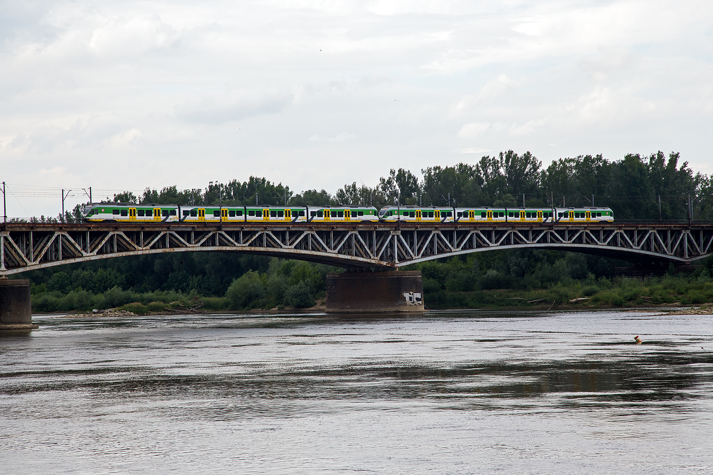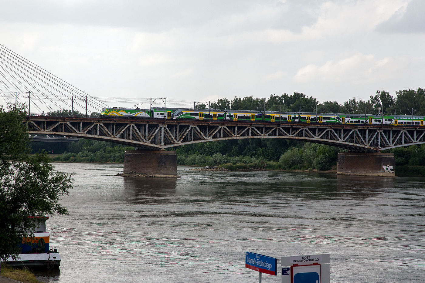 Zwei Züge der KM - Koleje Mazowieckie (Masowische Eisenbahnen) überqueren auf der Most Średnicowy (deutsch: Durchmesserbrücke) in Warschau am 26 Juni 2017 die Weichsel. Vorne ein vierteiliger PESA „Elf“ der Baureihe 22WE / EN76 der Richtung Osten (nach rechts) fährt, dahinter eine EU47 (Traxx P160 DC) mit Bombardier Doppelstockwagen, die Richtung Westen in die Stadt fährt und bald Warszawa Centralna (Warschau Zentralbahnhof) erreicht. Armin Schwarz