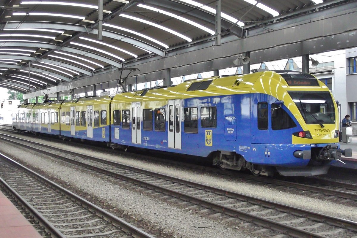 Der vierteilige elektrische Triebzüge vom Typ Stadler Flirt ED75-001 (2 140 000 -2) der Koleje Mazowieckie - KMKOL (Masowische Eisenbahnen), hat am 26 Juni 2017 den Bahnhof Warszawa Ochota (in Warschau) verlassen.