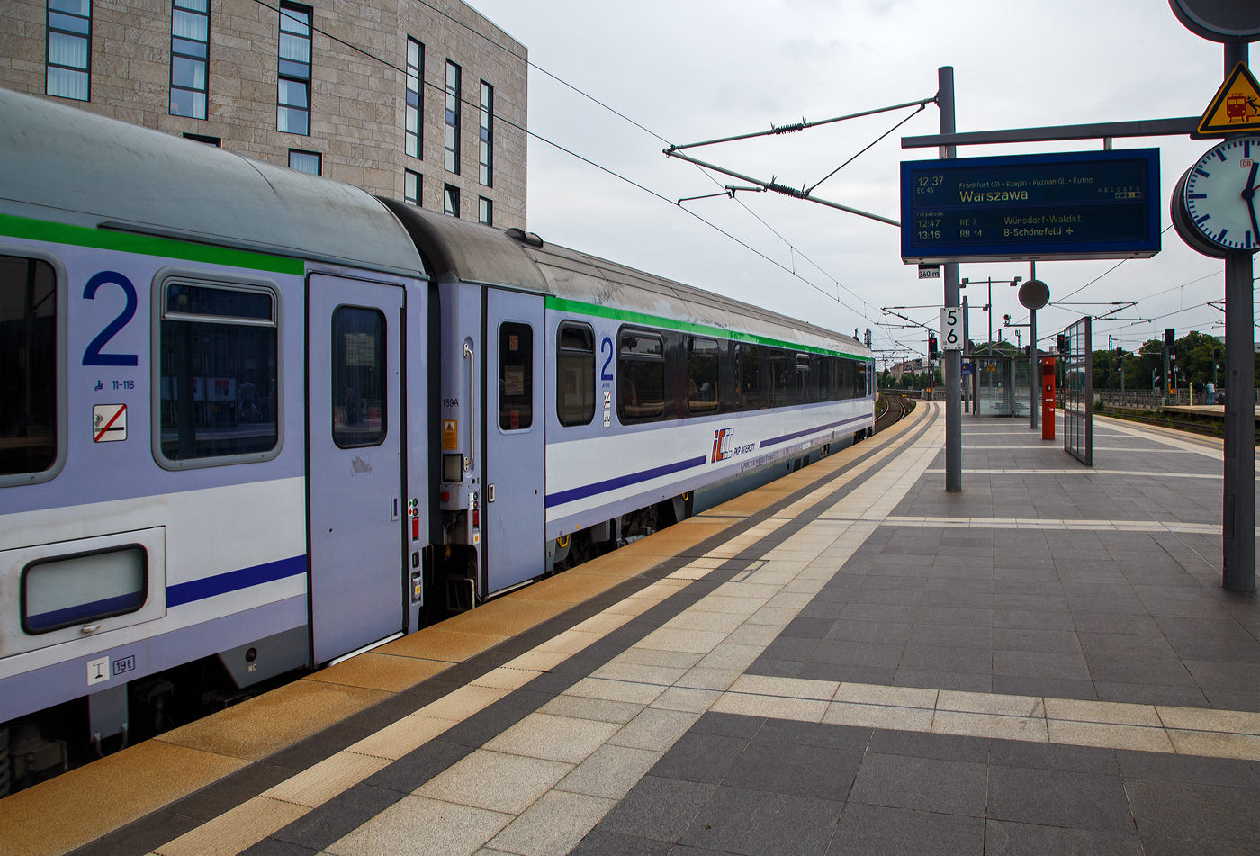 Die PKP Intercity "Husarz" Husar 5 370 010 (91 51 5370 005-8 PL-PKPIC 1251, ex 91 80 6183 610-5 D-STSLM), eine PKP BR EU 44 bzw. Siemens ES64U4-D, erreicht am 24. Juni 2017, mit dem IC 2078 von Dresden Hbf, den Zielbahnhof Berlin Hbf. Gleichdrauf wird der Zug hier zum EC 45 (DB) / EIC 71004 (PKPIC) „Berlin-Warszawa-Express“ von Berlin Hbf über Poznań Główny (Posen) nach Warszawa Wschodnia (Warschau Ost). Die Siemens ES64U4-D (wie Taurus III) wurde 2009 vom Siemens-TS Werk in Linz unter der Fabriknummer 21664 gebaut und im März 2010 erst als 183 605 (91 80 6183 610-5 D-STSLM) von Siemens in Deutschland eingestellt und an die PKP Intercity vermietet, im Juli 2010 übernahm dann die PKP Intercity. Hier 2017 fuhr sie mit der Ganzreklame "T-mobile - Supernet". Bei der PKP wird sie als Baureihe EU 44 „Husarz“ (Husar) geführt. Die Lok hat die Zulassung in PL/ D/ A/ CZ. Die ES64U4 ist eine schnellfahrende Mehrsystemlokomotive für das europäische AC- und DC-Schienenverkehrsnetz. Sie erweitert die Siemens EuroSprinter-Familie („ES“) im hohen Dauerleistungsbereich von bis zu 6.400 kW („64“) mit den vorhandenen schnellfahrenden Mehrsystem-Universallokomotiven („U“) für AC-Netze sowie den vorhandenen Güterzug-Mehrsystemlokomotiven für AC- und DC-Netze. Diese ES64U4 der PKP Baureihe EU 44 ist für den Betrieb in folgenden Stromsystemen geeignet: AC 15 kV 16,7 Hz AC 25 kV 50 Hz DC 1,5 kV DC 3 kV Die EuroSprinter-Familie markierte den modernsten Stand der Drehstrom-Antriebstechnik für Universallokomotiven der höchsten Leistungsklasse. Am 2. September 2006 stellte die Lokomotive 1216 050, welche sich zu diesem Zeitpunkt noch im Besitz von Siemens befand (und bei der ÖBB später als 1216 025 geführt wurde), auf der Neubaustrecke Nürnberg–Ingolstadt einen Weltrekord für konventionelle Lokomotiven auf. Sie erreichte im ersten Versuch 344 km/h und im zweiten Versuch 357 km/h und überbot damit beide Male den Rekord der SNCF BB 9004 aus dem Jahre 1955 (331 km/h). Technische Daten: Spurweite: 1.435 mm Achsfolge: Bo’Bo’ Länge über Puffer:19.580 mm Breite: 3.019 mm Drehzapfenabstand: 9.900 mm Radsatzabstand im Drehgestell: 3.000 mm Eigengewicht: 87 t Dauerleistung: 6.400 kW (8704 PS) bei AC 25 kV und AC 15 kV 6.000 kW bei DC 3 kV 3.000–4.200 kW bei DC 1,5 kV Höchstgeschwindigkeit: 230 km/h (in Polen zugel. 160 km/h) Anzahl der Fahrmotoren: 4 Antrieb: Kardan-Hohlwellen-Antrieb Anfahrzugkraft: 300 kN Dauerzugkraft: 250 kN Raddurchmesser: 1.150 mm / 1.070 mm (neu/abgenutzt)