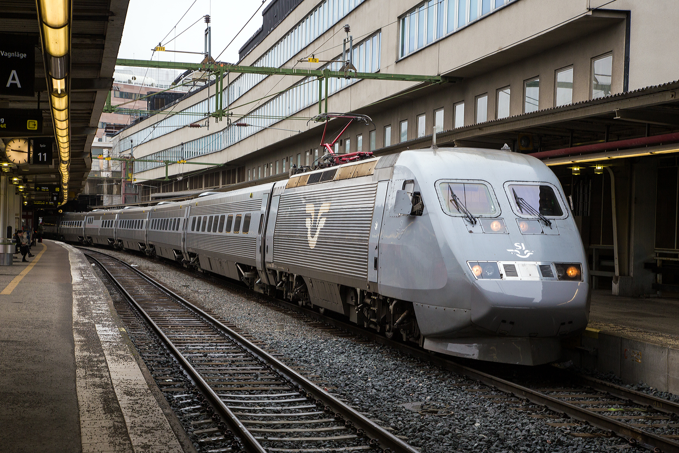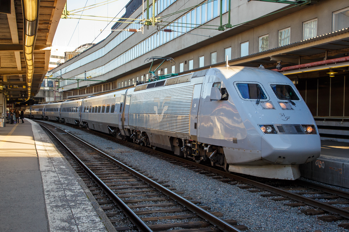 Der sechsteilige zweisystem SJ X2K 2041 (SJ X2000) der SJ (Statens Järnvägar AB, ehemaligen schwedische Staatsbahnen) steht am 20 März 2019 auf Gleis 26 im Hauptbahnhof Kopenhagen (dän. Københavns Hovedbanegård), als X2 nach Stockholm Central zur Abfahrt bereit. Die Züge sind allgemein unter dem geschützten Markennamen X2000 bekannt.