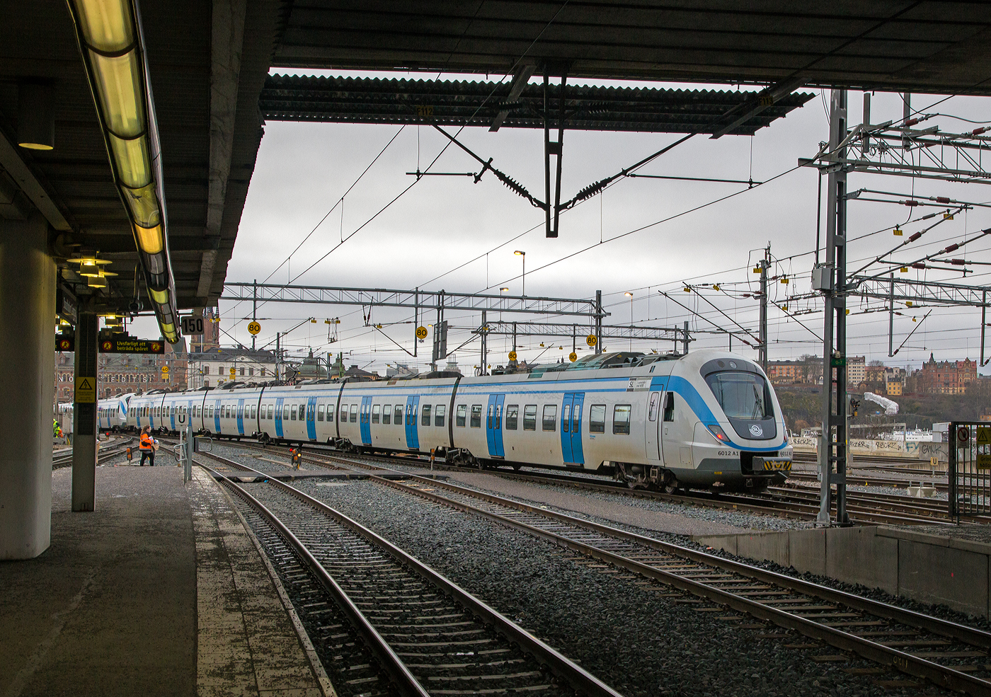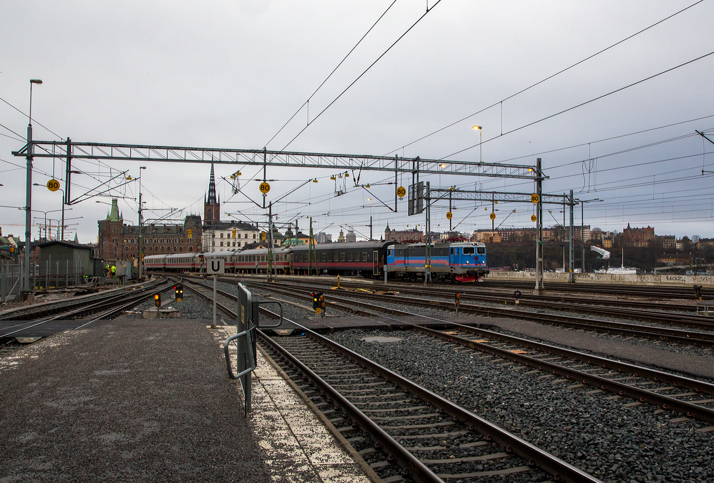 Der siebenteilige einsystem Hochgeschwindigkeitstriebzug SJ X2000 Snabbtåg SJ X2 2007 (S-SJ 93 74 302 2007-2 X2) der SJ (Statens Järnvägar AB, ehemaligen schwedische Staatsbahnen) am 21 März 2019 im Bahnhof Stockholm Central (Stockholm Hbf).