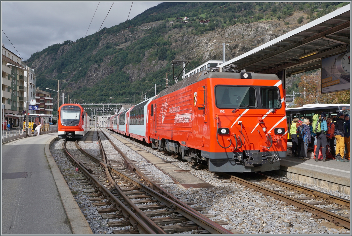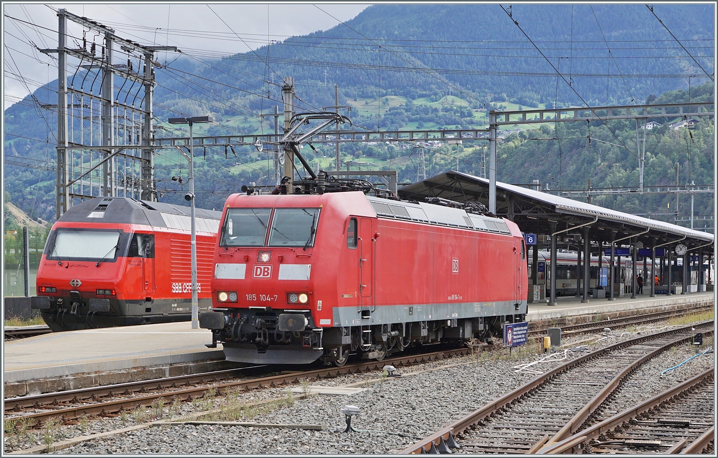 Der SBB RABe 531 001 ist auf einer Testfahrt und erreicht dabei sein Ziel Brig. Zudem ist links im Bild ein SBB RABe 503/ETR 610 zu erkennen und im Hintergrund steht ein BLS NINA.