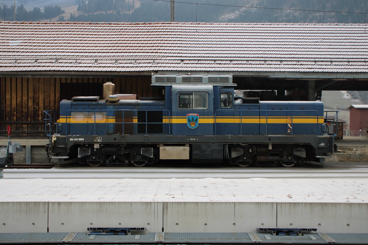 Die MOB Gm 4/4 2004 steht abfahrbereit mit dem Schotterzug in Vevey.