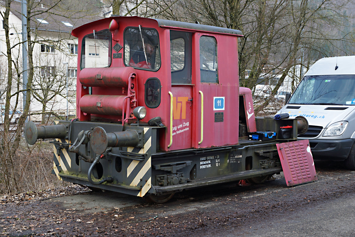 Verein EW Nostalgie: Vom Ruhrgebiet in die Schweiz. Nach einem Aufenthalt als Denkmallok bei VT Verkehrs- und Industrietechnik AG, Neuenhof fand diese für die Schweiz einmalige Lok ihren neuen Platz beim Verein EW Nostalgie, der die Tm 2/2 O&K am 7. Januar 2017 auf der Strasse in die Klus bei Balsthal zügelte. Vorerst findet sie Verwendung um die Personenwagen zu rangieren, die in einer auf dem Industriegebiet stehenden Halle der früheren von Roll AG aufgearbeitet werden. Am ll. Fbebruar 2017 konnte die sehr spezielle Lok zum ersten Mal in ihrer neuen Heimat abgelichtet werden. Foto: Walter Ruetsch