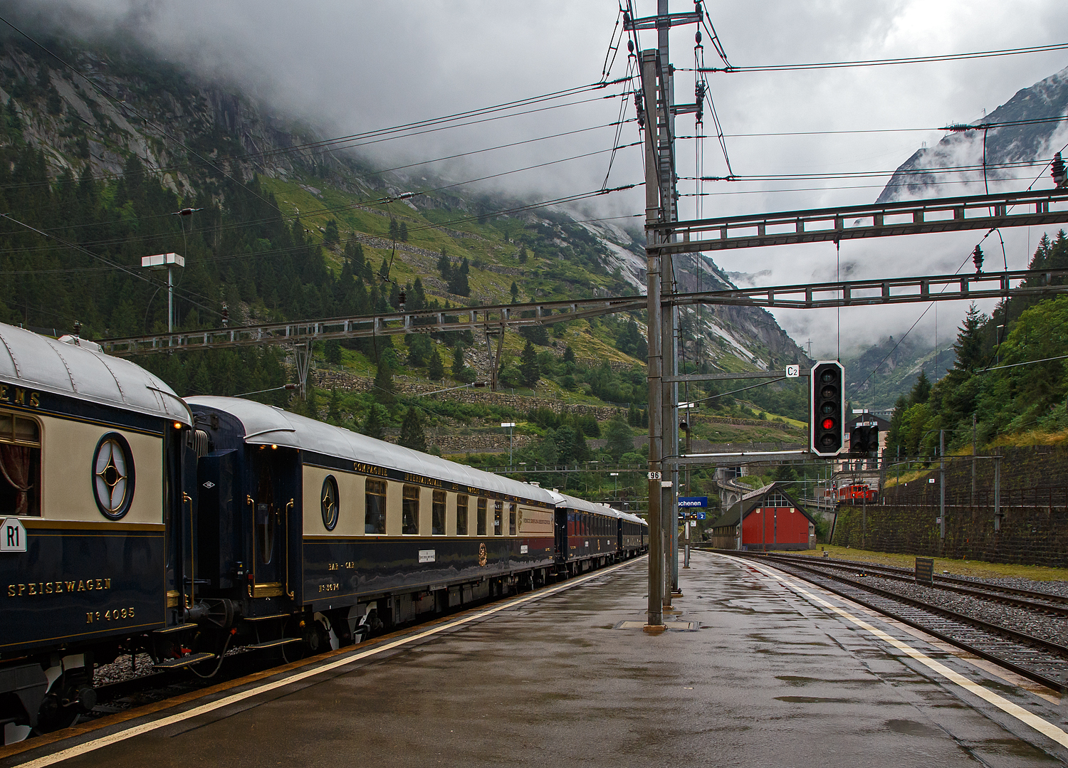 Gezogen von einer SBB Re 8/8 (Doppeltraktion der Re 4/4 11194 und der Re 4/4 11156) verlässt der VSOE - Venice Simplon-Orient-Express von Amsterdam über Brüssel und Paris nach Venedig am 02 August 2019, leider bei Regen, den Bahnhof Göschenen. Hier fährt er nicht, wie es im Namen steht, durch den Simplon, sondern über den Gotthard. Der „König der Züge“ der Orient-Express, bestand aus einem Zug mit 18 Wagen, es waren modernisierte historische ehemalige CIWL-Wagen. Ob es auch einen „Mord im Orient-Express“ gab? Das kann ich nicht sagen, hatte aber gehört das man wohl einen im Zug nachspielte.