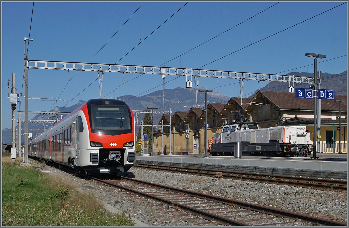 In Bex stehen zwei neue EVO RABe 531/533: Vorne der TMR Region Alpes RABe 533 703 und weniger gut zu sehen der RABe SBB RABe 531 002. Zudem fährt gerade eine SERSA Aem 940 durch den Bahnhof. 30. Oktober 2024