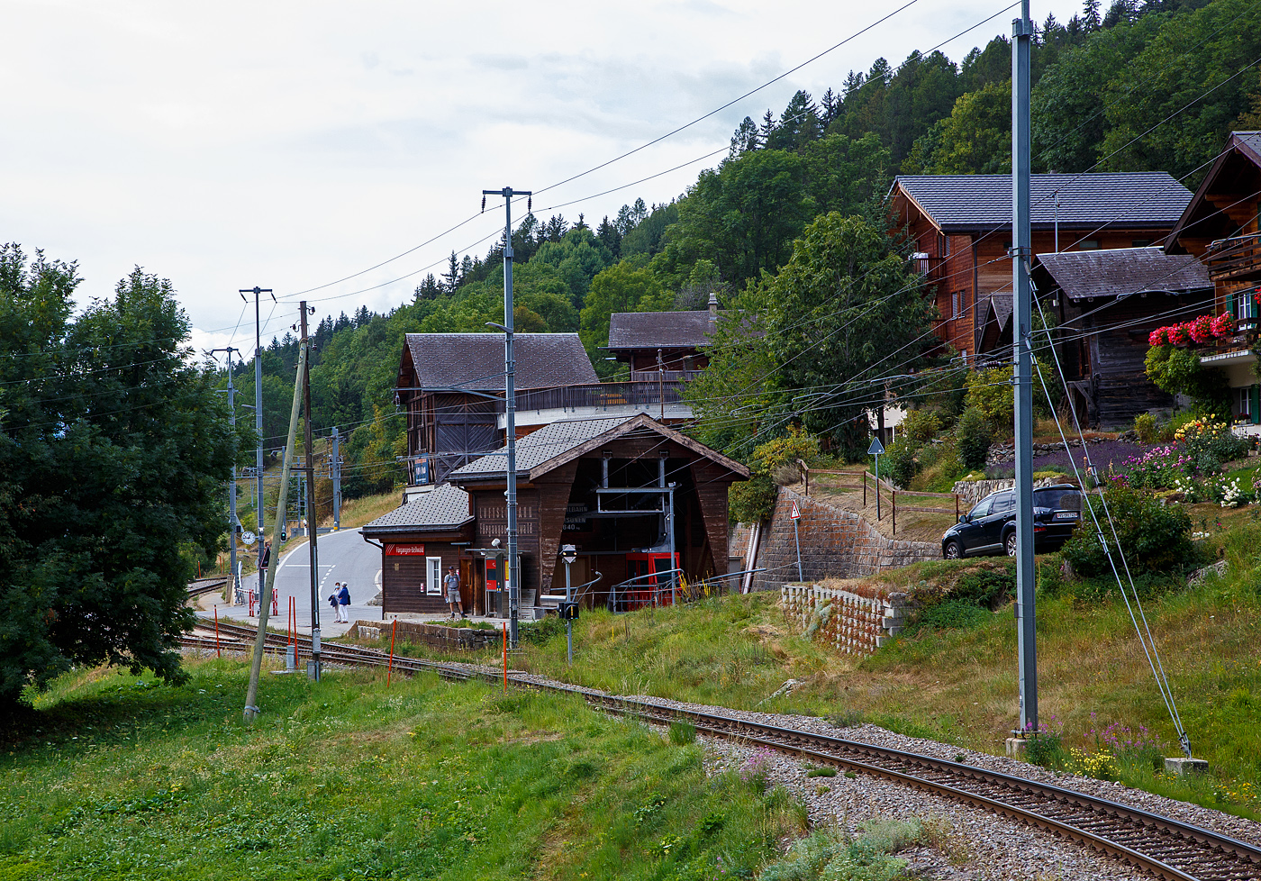 Hinten in der Remise steht ein MGB Gepäcktriebwagen Deh 4/4 I, ex FO Deh 4/4 I, welche Fahrzeugnummer (51 bis 55) es ist kann in nicht sagen, da die Nummern an den Fronten nicht angeschrieben werden.