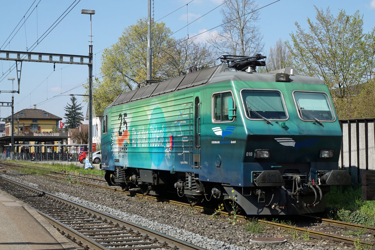 Re 4/4 IV (Bahn Rail Ferrovia 2000) in Lausanne im April 1987.