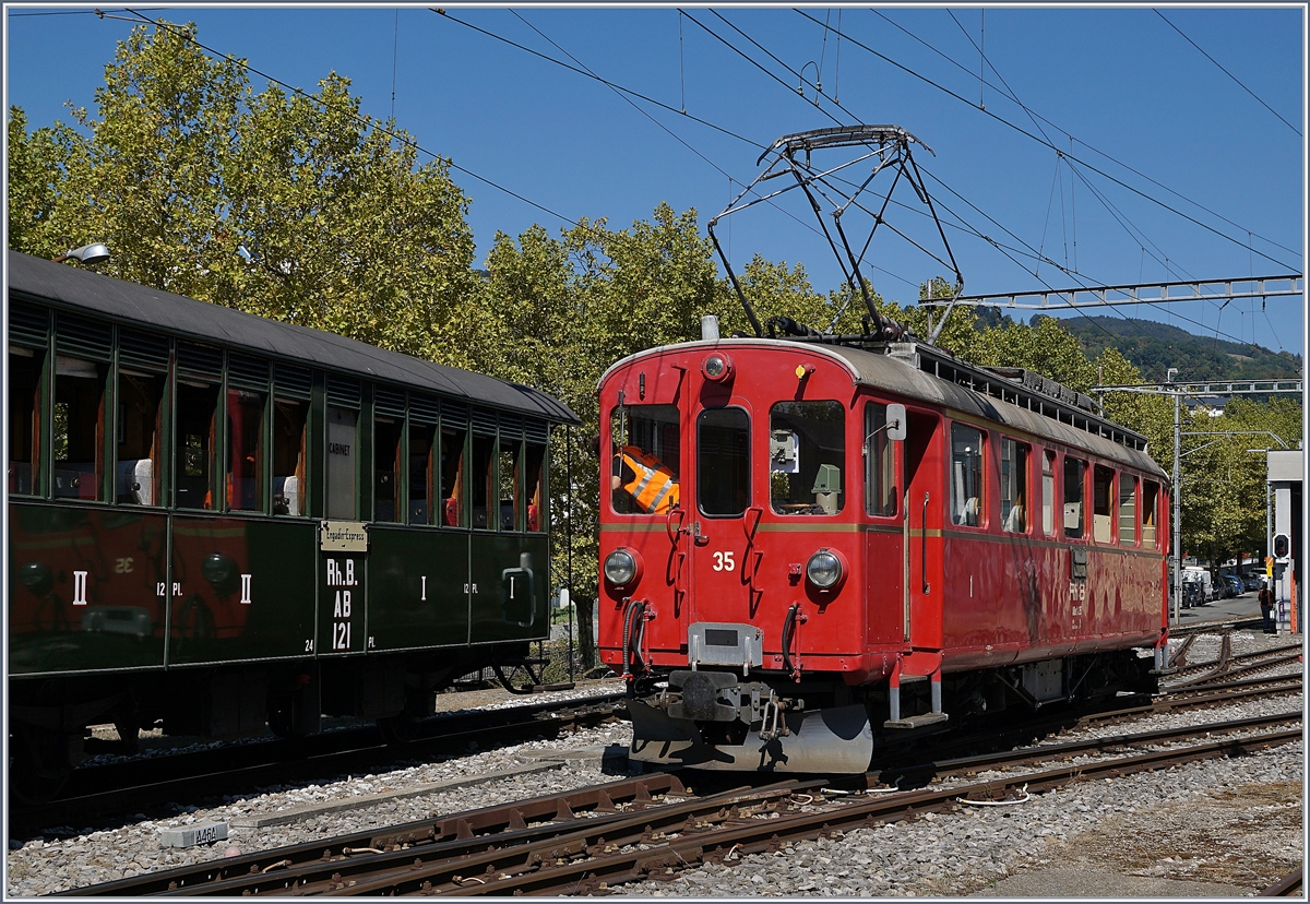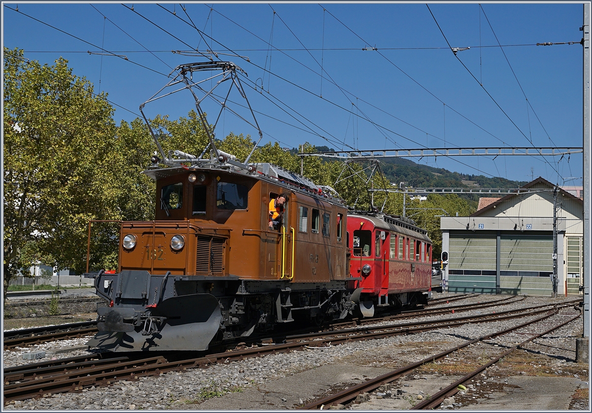 La Dernière du Blonay - Chamby - das 50. Jahre Jubiläum beschliesst die Blonay Chamby Bahn mit einer Abschlussvorstellung: Doch auch eine Museumsbahn ist den üblichen Fahrdienstvorschriften unterworfen und so warte die vorgängig mit einer roten Fahne gestoppte Berninabahn Ge 4/4 81 in Blonay auf ein freies Gleis.