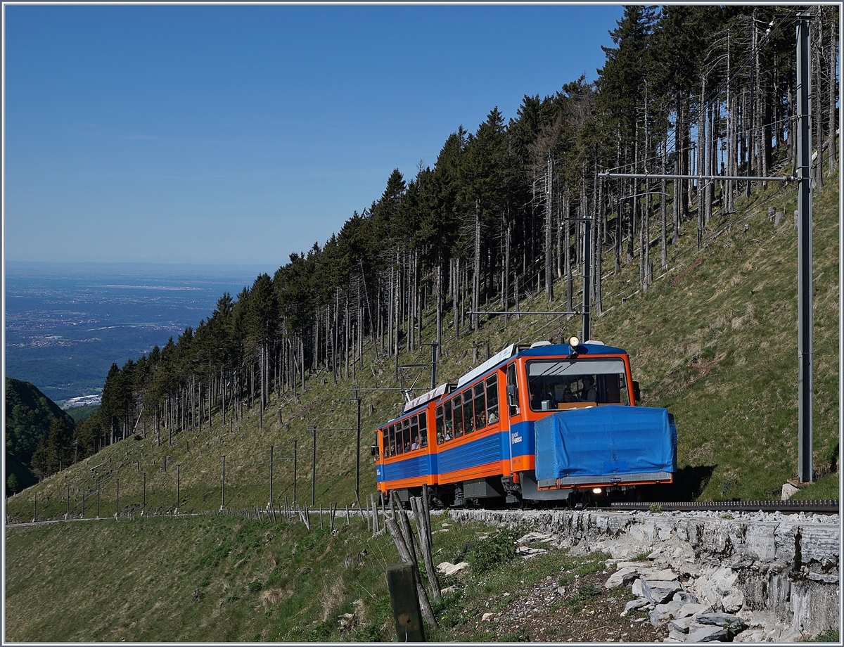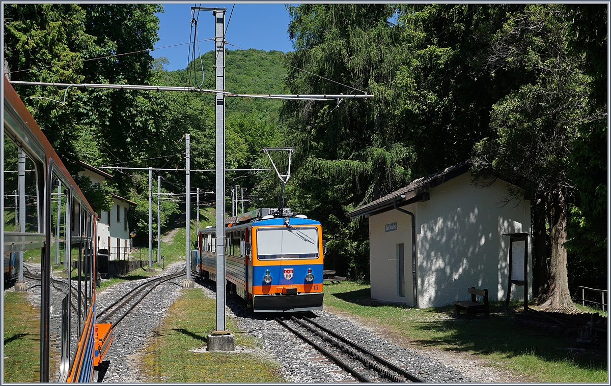 Endlich - nach drei Jahren Baustellen bedingtem Unterbruch fährt die Monte Generoso Bahn wieder! Die beiden Bhe 4/8 N° 12 (Mendrisio) und N° 13 (Salornio) warten in Generoso Vetta auf die Abfahrt Richtung Capolago. 21. Mai 2017